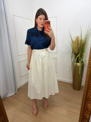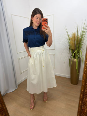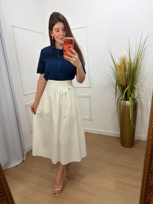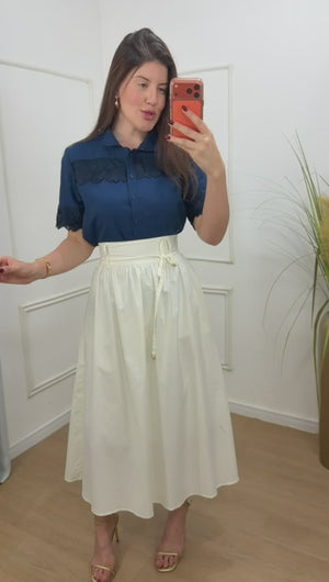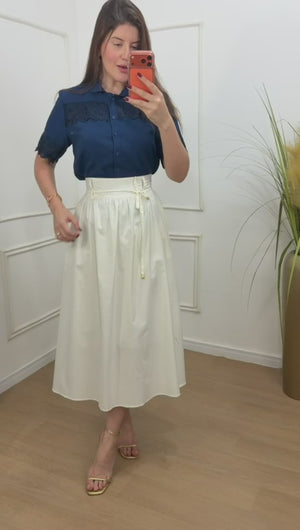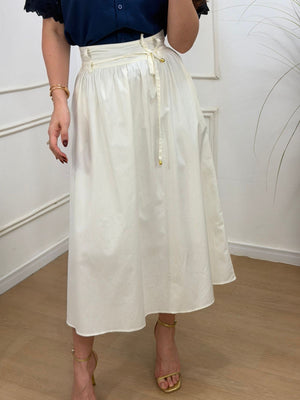 Saia no tricoline 100% algodão com forro, possui bolsos e acompanha faixa, elástico na parte de trás.