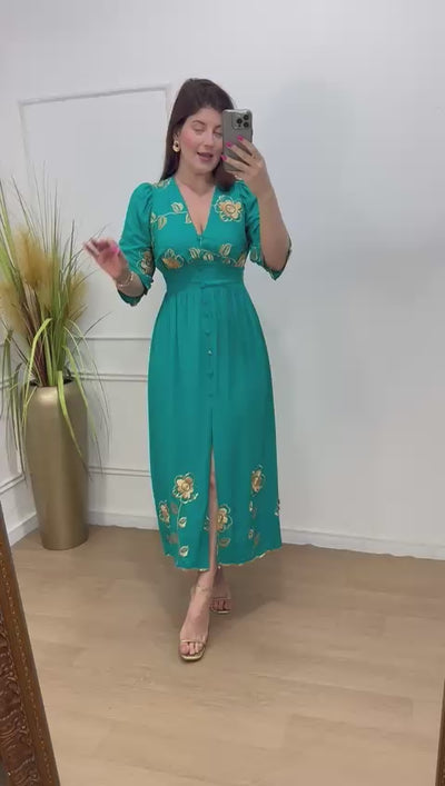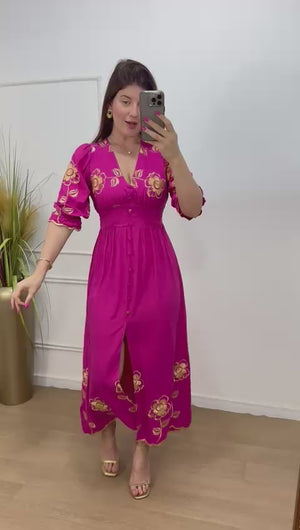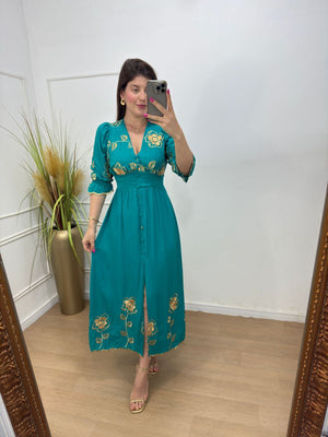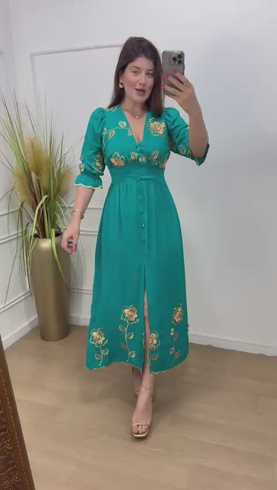 Descrição: vestido no viscosarja bordado forrado decote V botões não funcionais forrado, elástico nas costas.