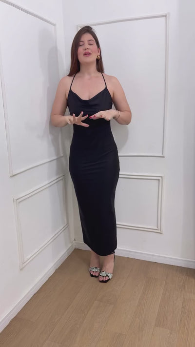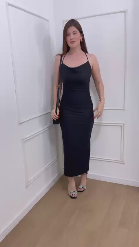 Vestido no tecido prada encorpado com bastante elastano, possui poliamida na composição, gola boba, decote nas costas, com transpasse.