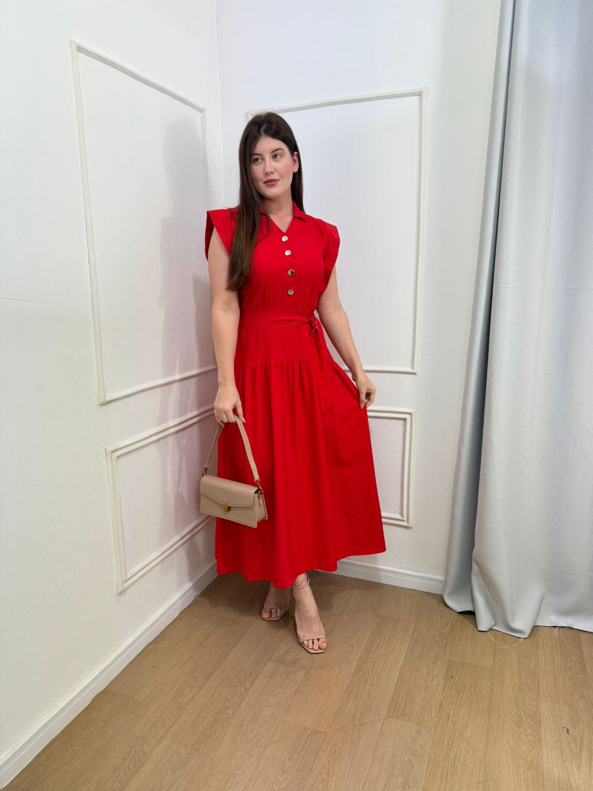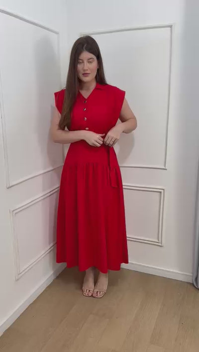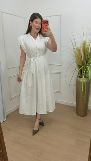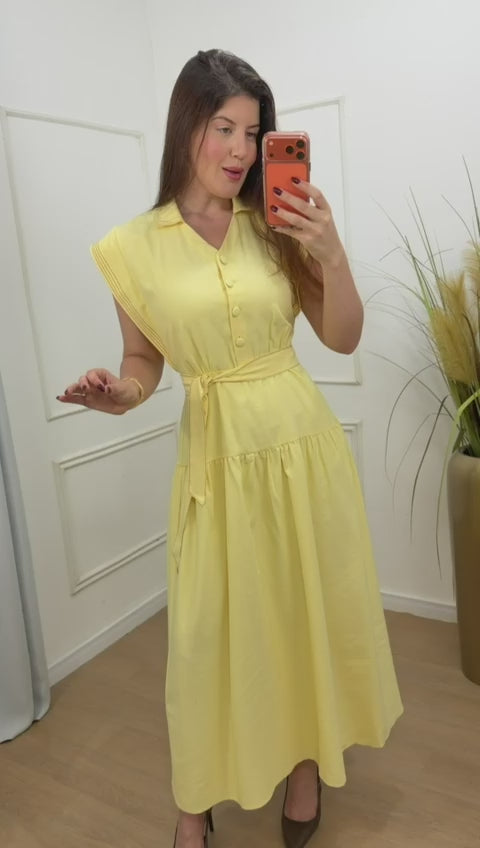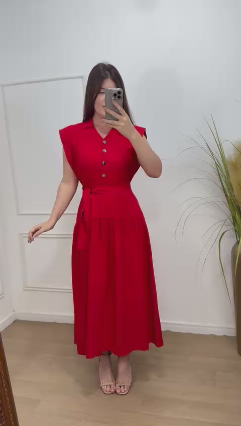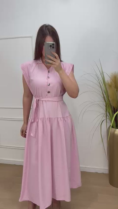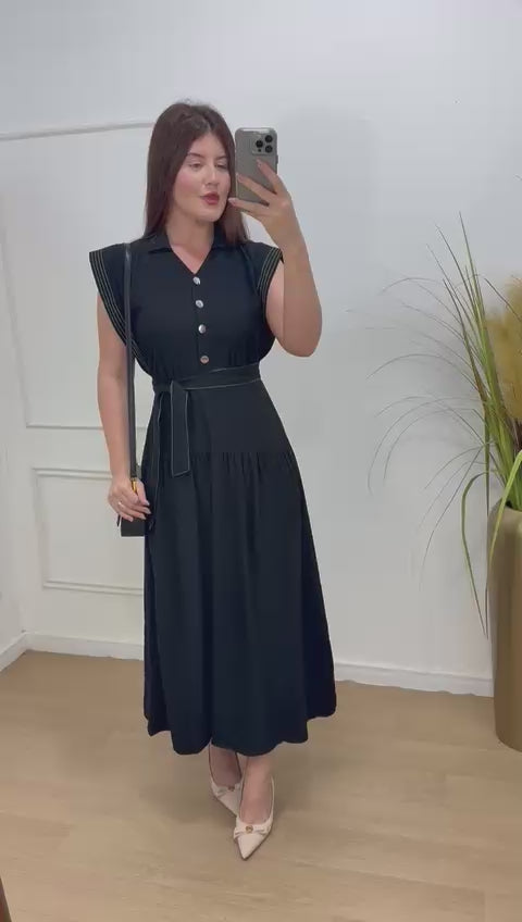 Vestido na alfaiataria sensorial elástico nas costas , acompanha faixa, possui botões frontais.