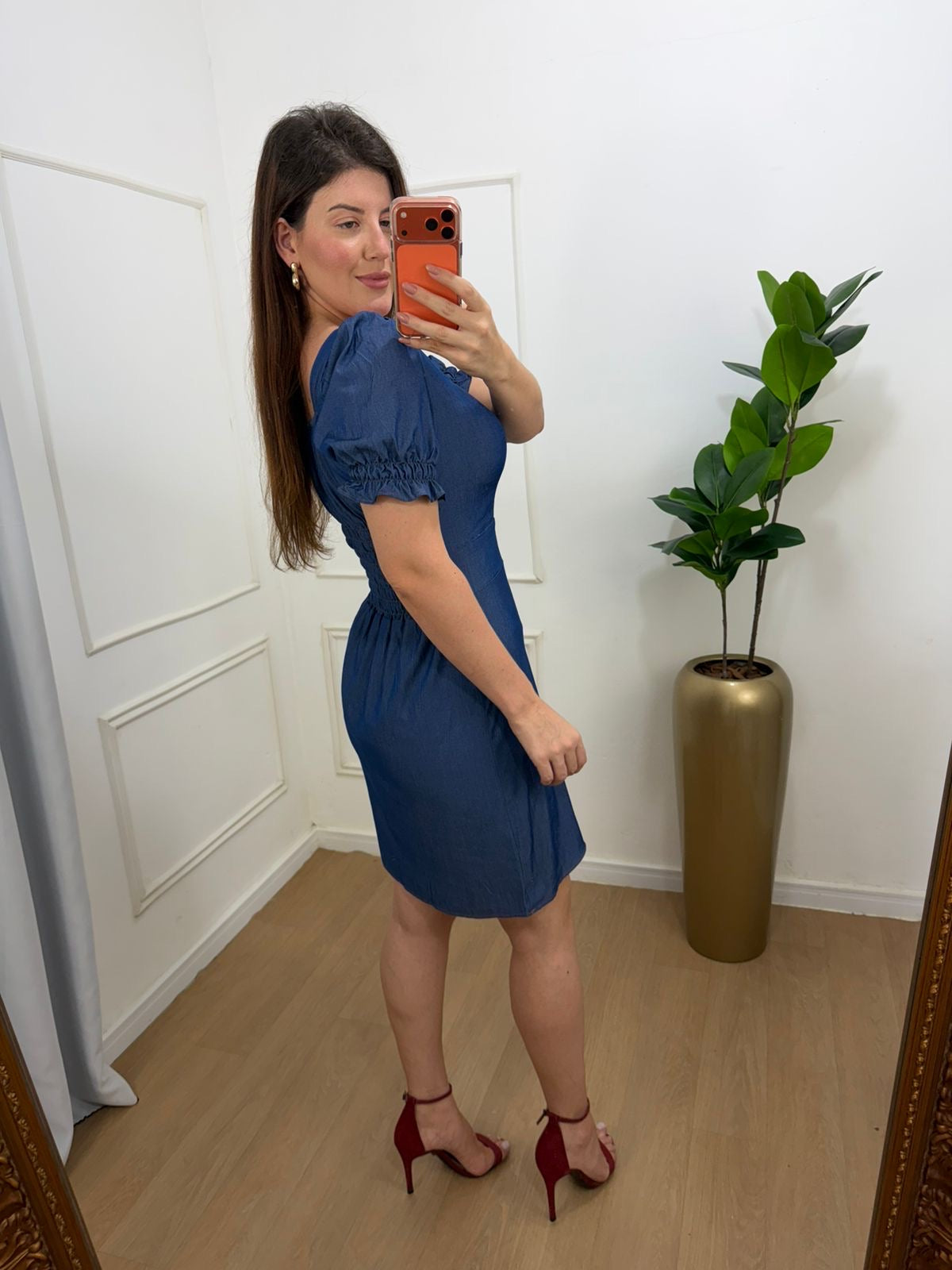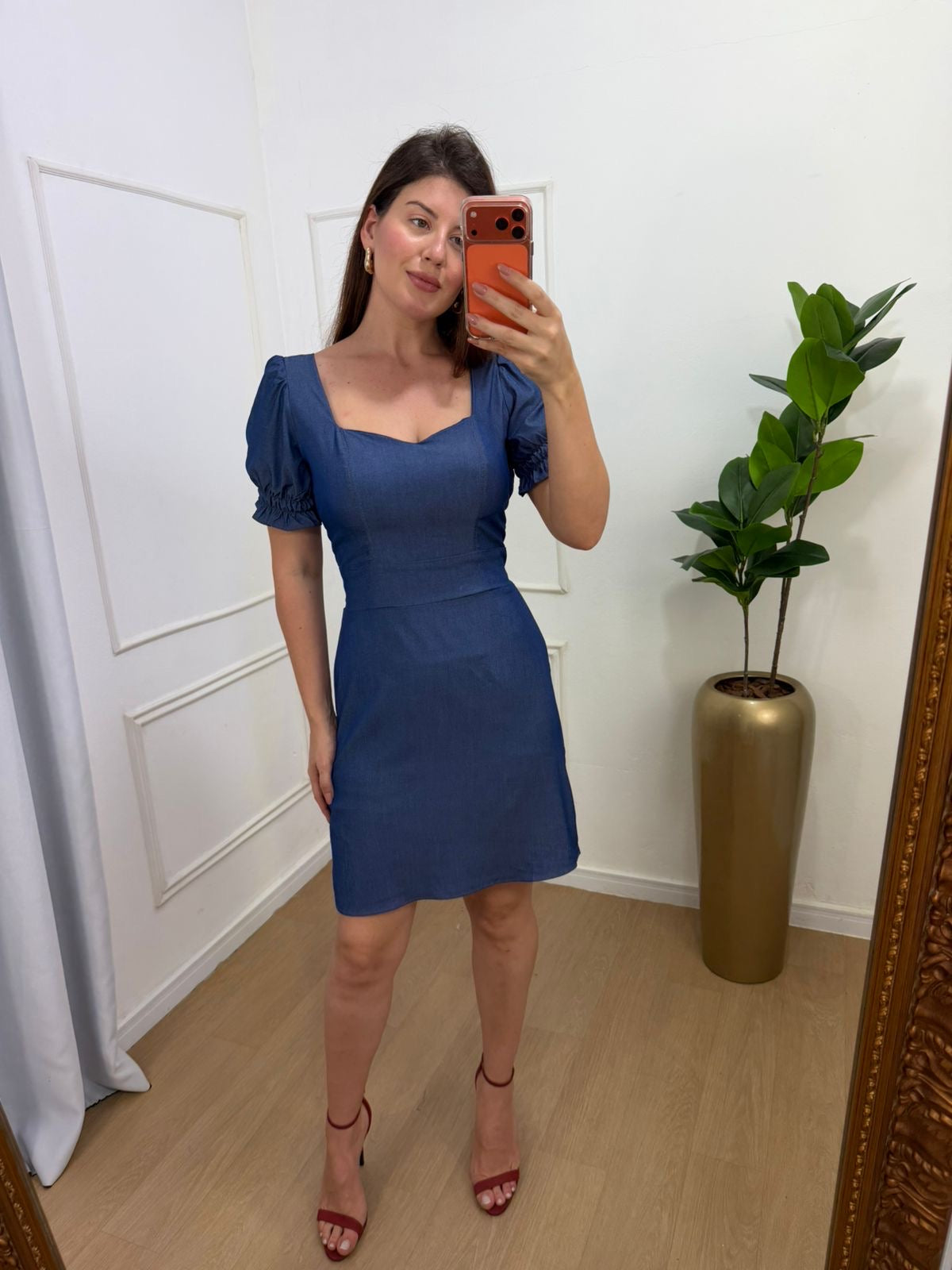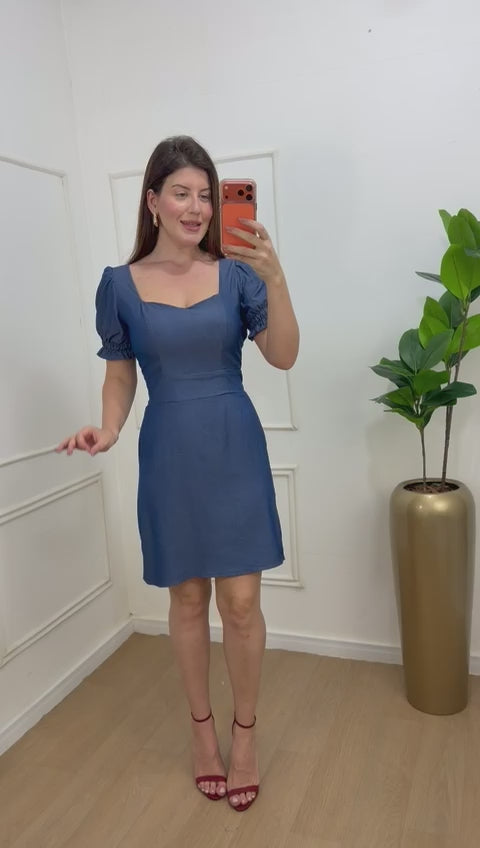 Vestido jeans modelagem secretária, bojo no busto, elástico nas mangas .
