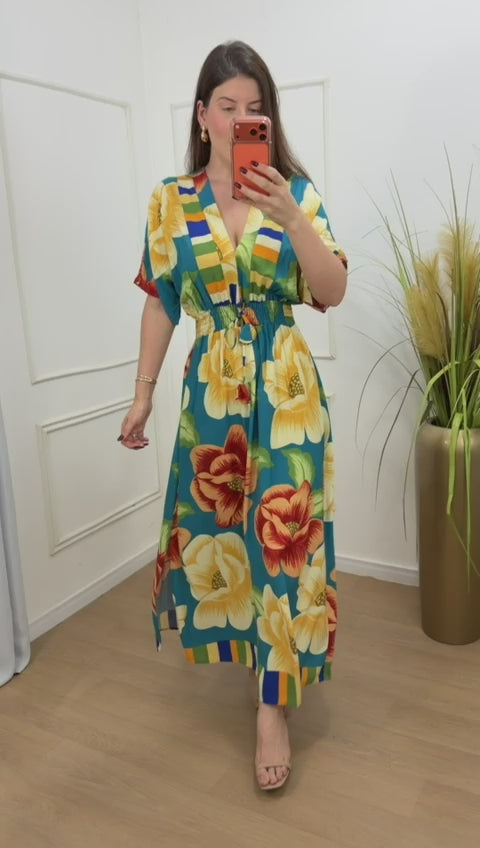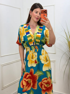Vestido no viscolinho premium elástico na cintura amarração.