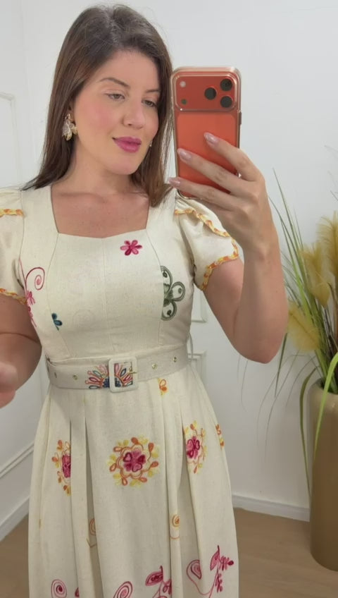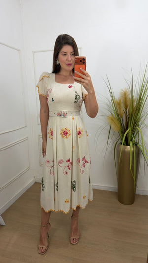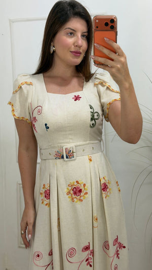 Vestido no linho bordado acompanha cinto, possui forro decote coração, manga dupla.