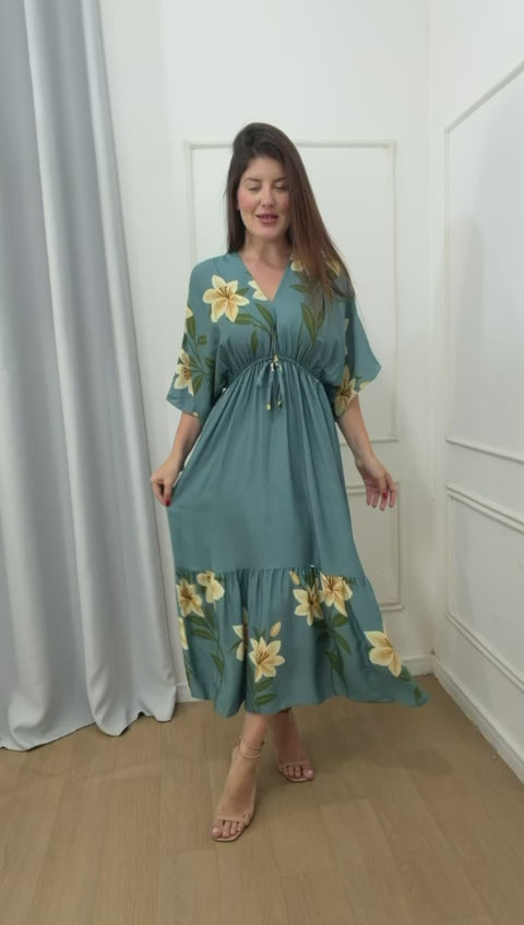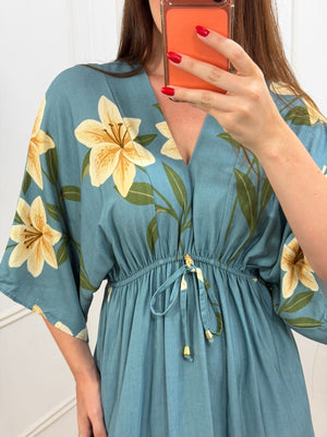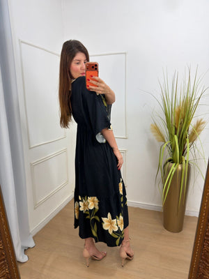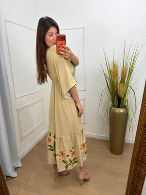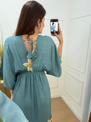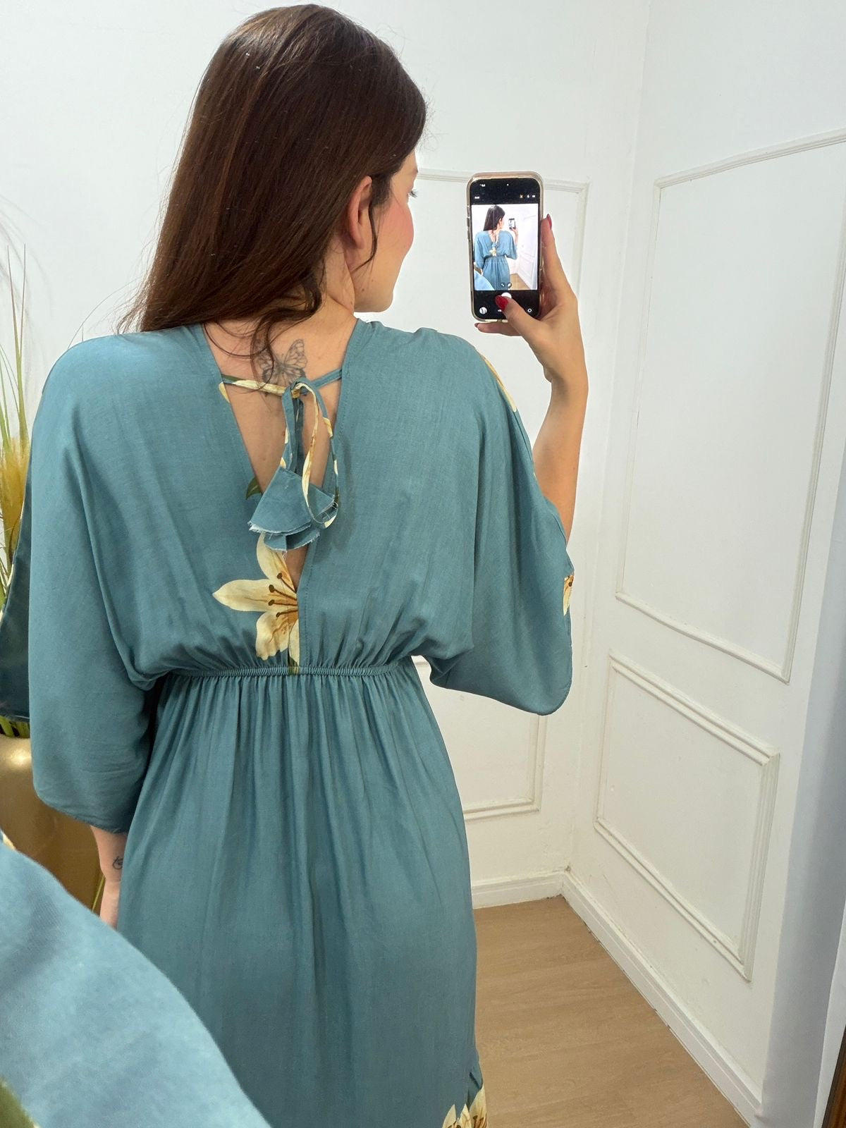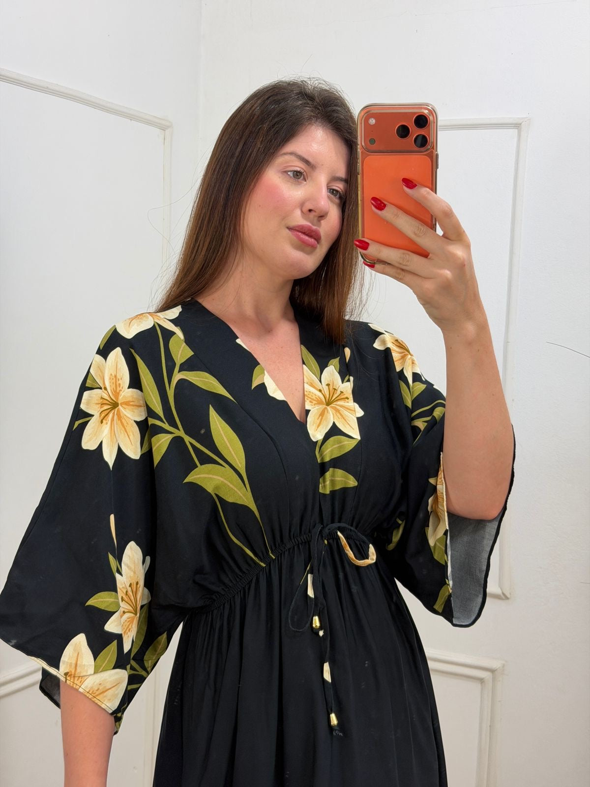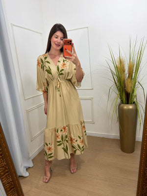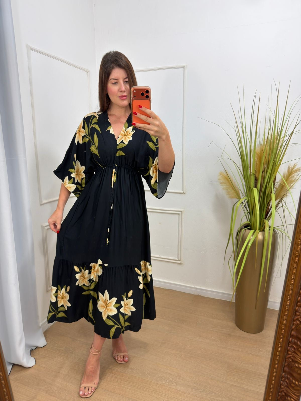 Vestido no viscolinho sarjado mangas largas, elástico na cintura, amarração na parte de trás.