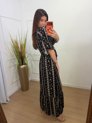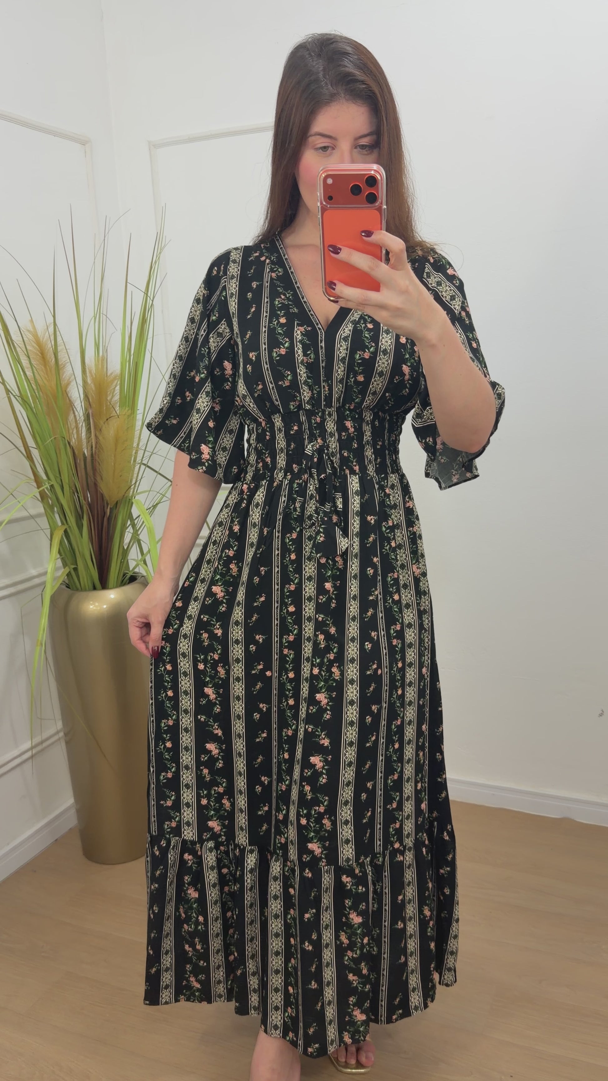 Vestido no viscolinho forrado lastex na cintura manga flare
