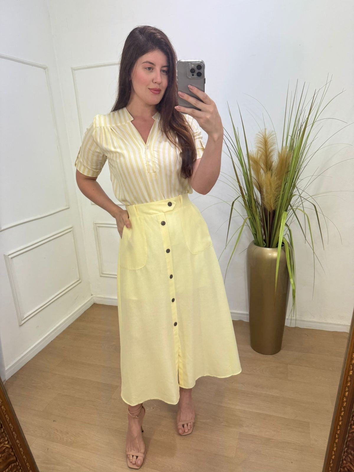 Blusa gola padre com botões funcionais frontal, botão na manga no viscolinho.