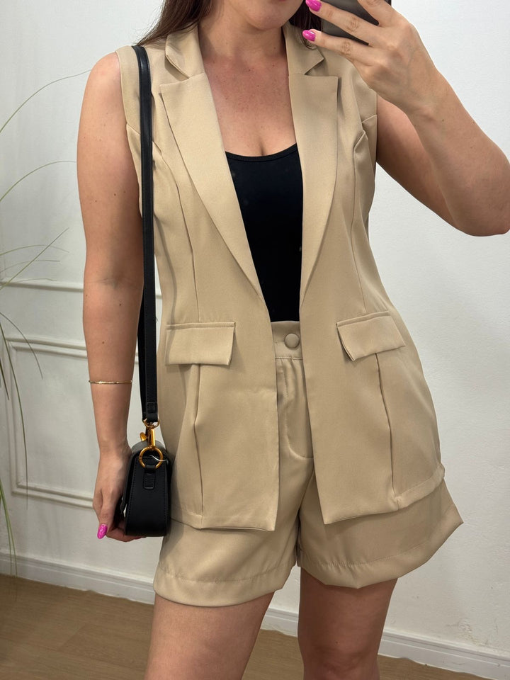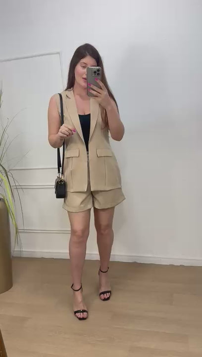 Conjunto na alfaitaria de colete+ bermuda modelagem larguinha, possui bolso frontal na bermuda , colete bolso falso.
