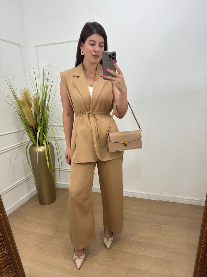 Conjunto na alfaitaria colete com manga todo forrado estruturado possui ombreiras, botão frontal+ amarração.