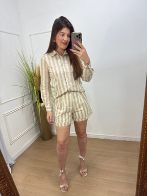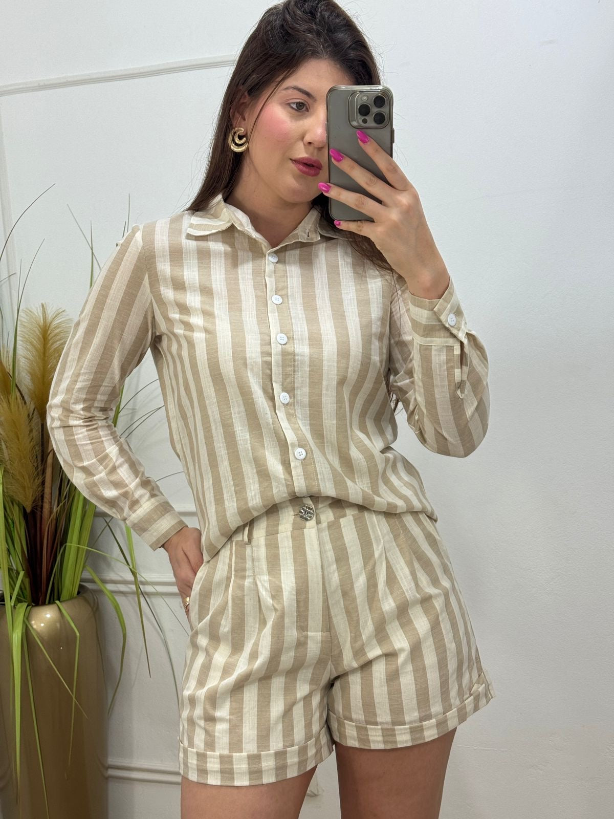 A camisa com modelagem soltinha e a bermuda de cós alto com forro interno garantem conforto e elegância em cada detalhe.