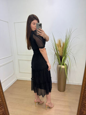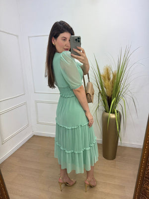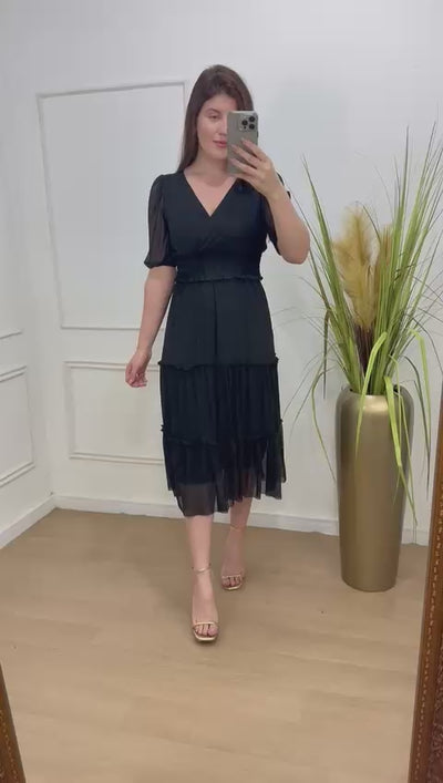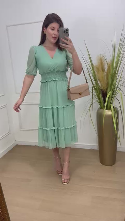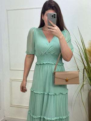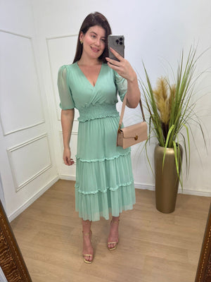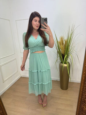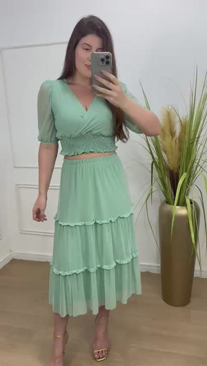 Conjunto no tule com elastano forrado decote transpassado, elástico na cintura manga 3/4.
