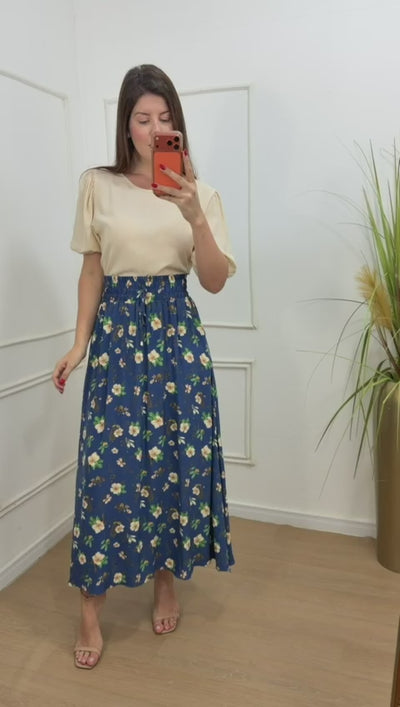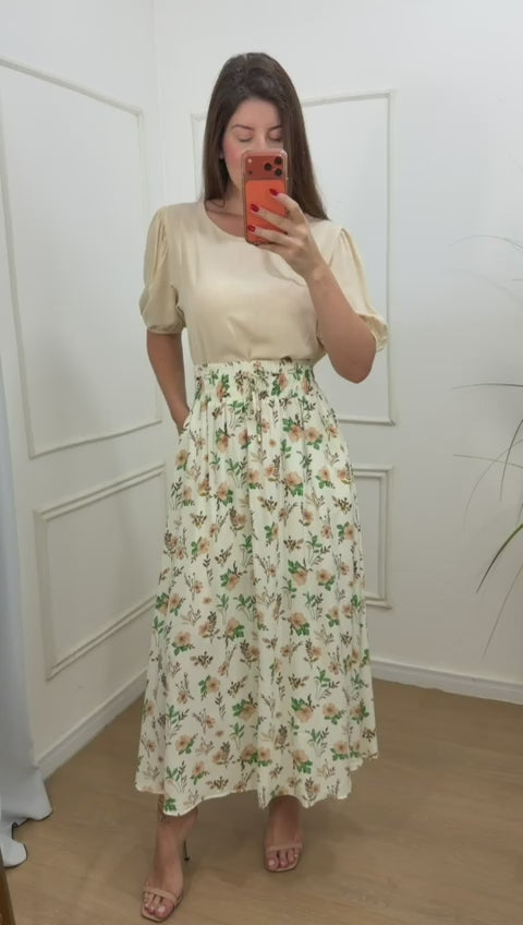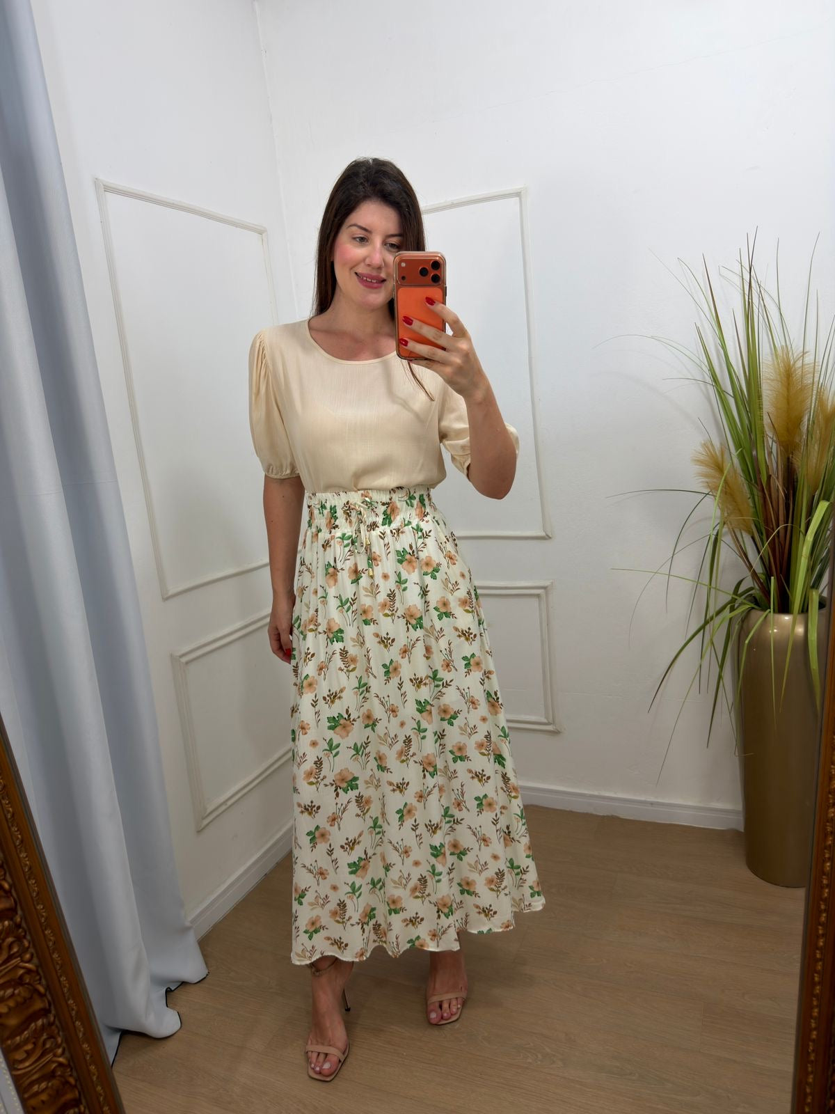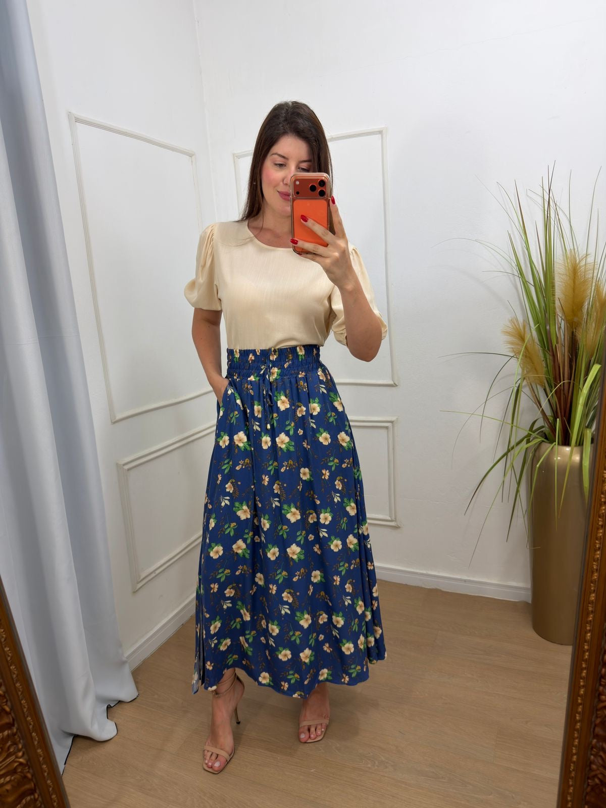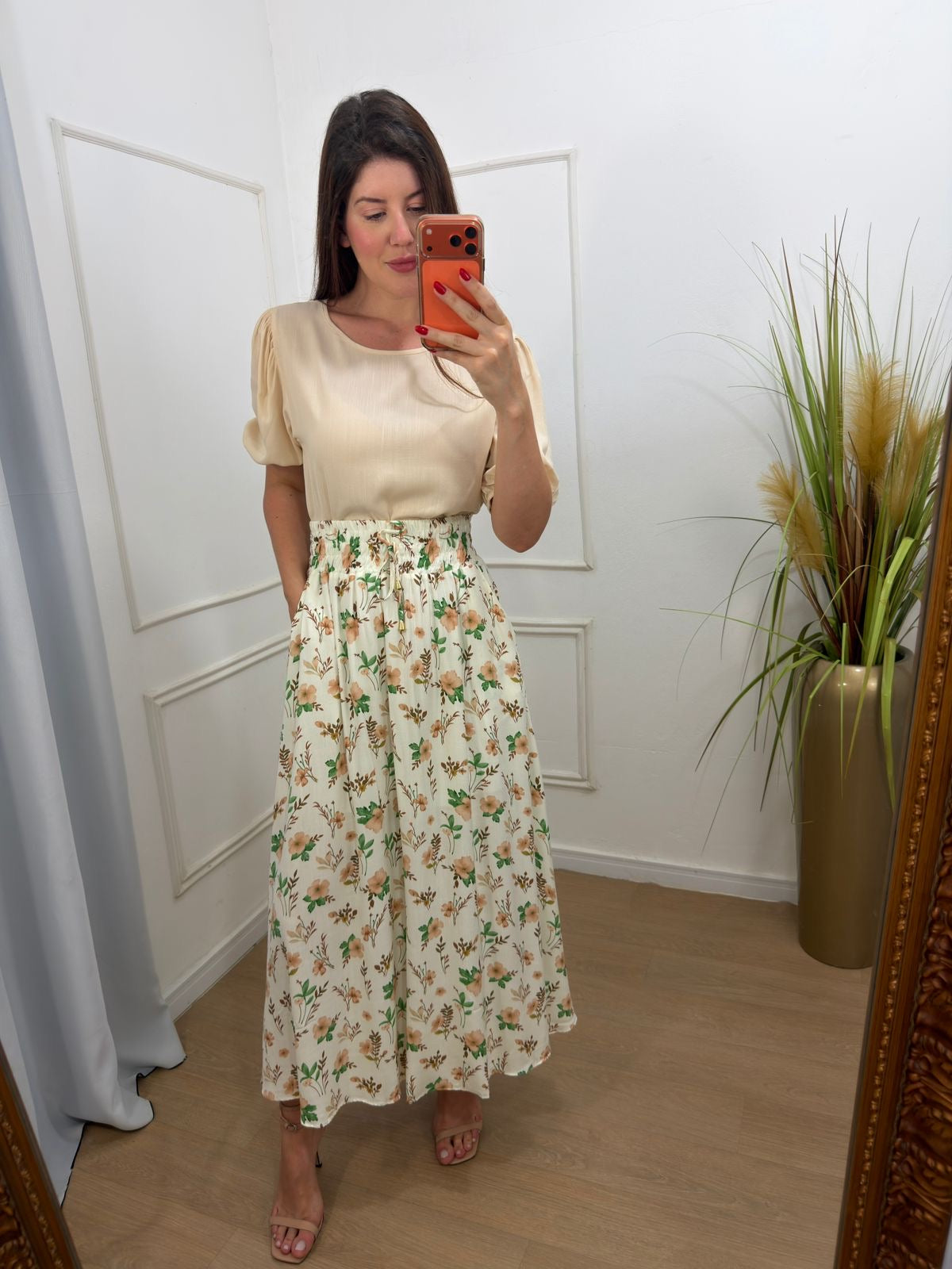 Saia no viscolinho + blusa viscose possui forro na saia, bolso na lateral, saia fluida, elástico no cós.
