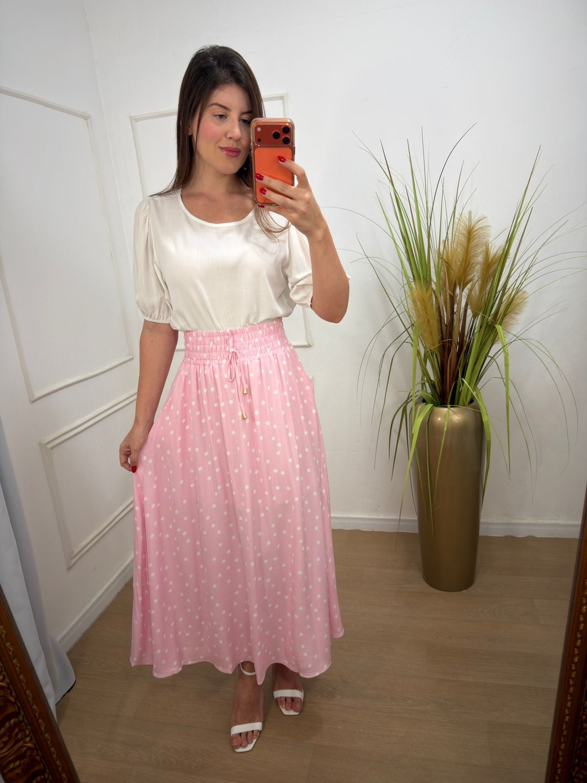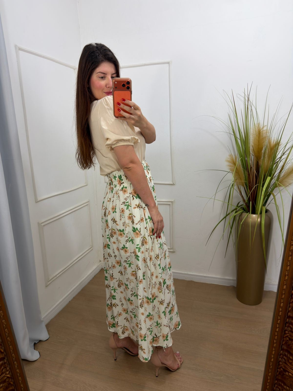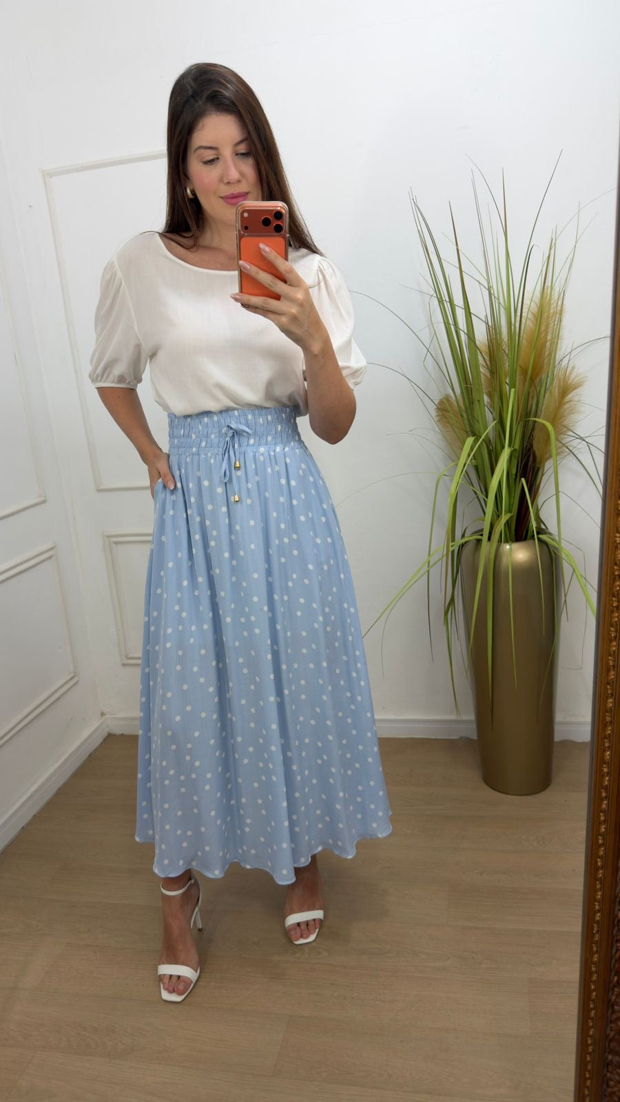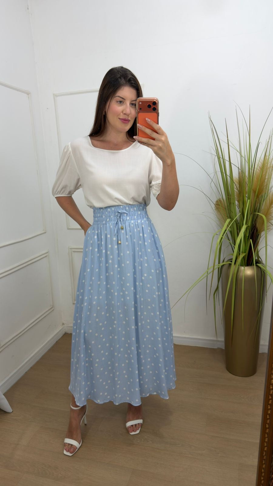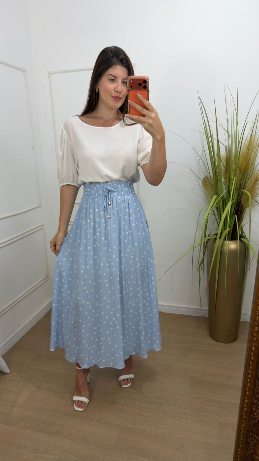 Saia no viscolinho + blusa viscose possui forro na saia, bolso na lateral, saia fluida, elástico no cós.