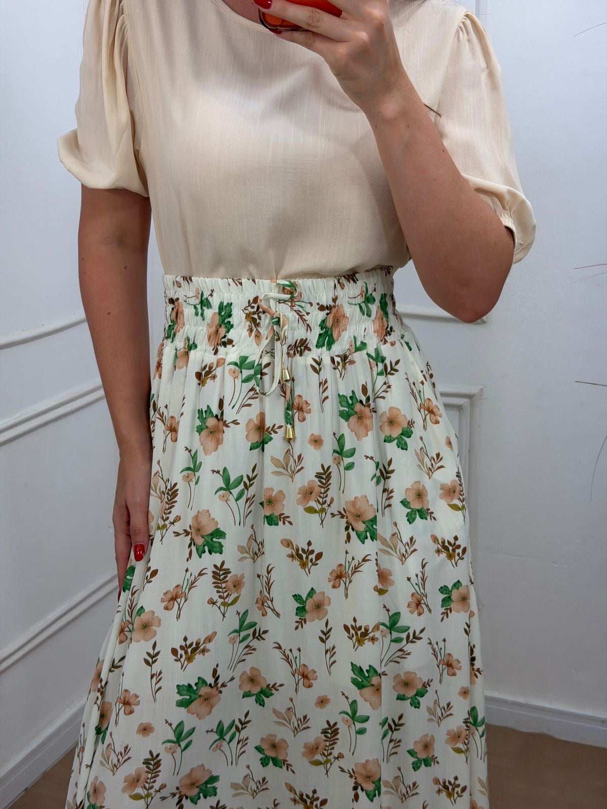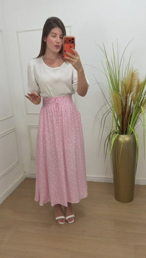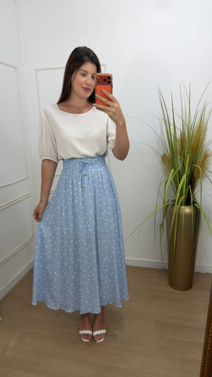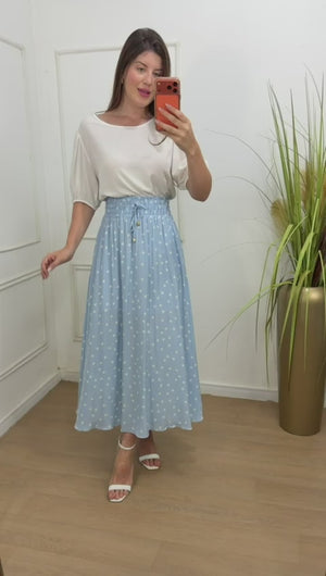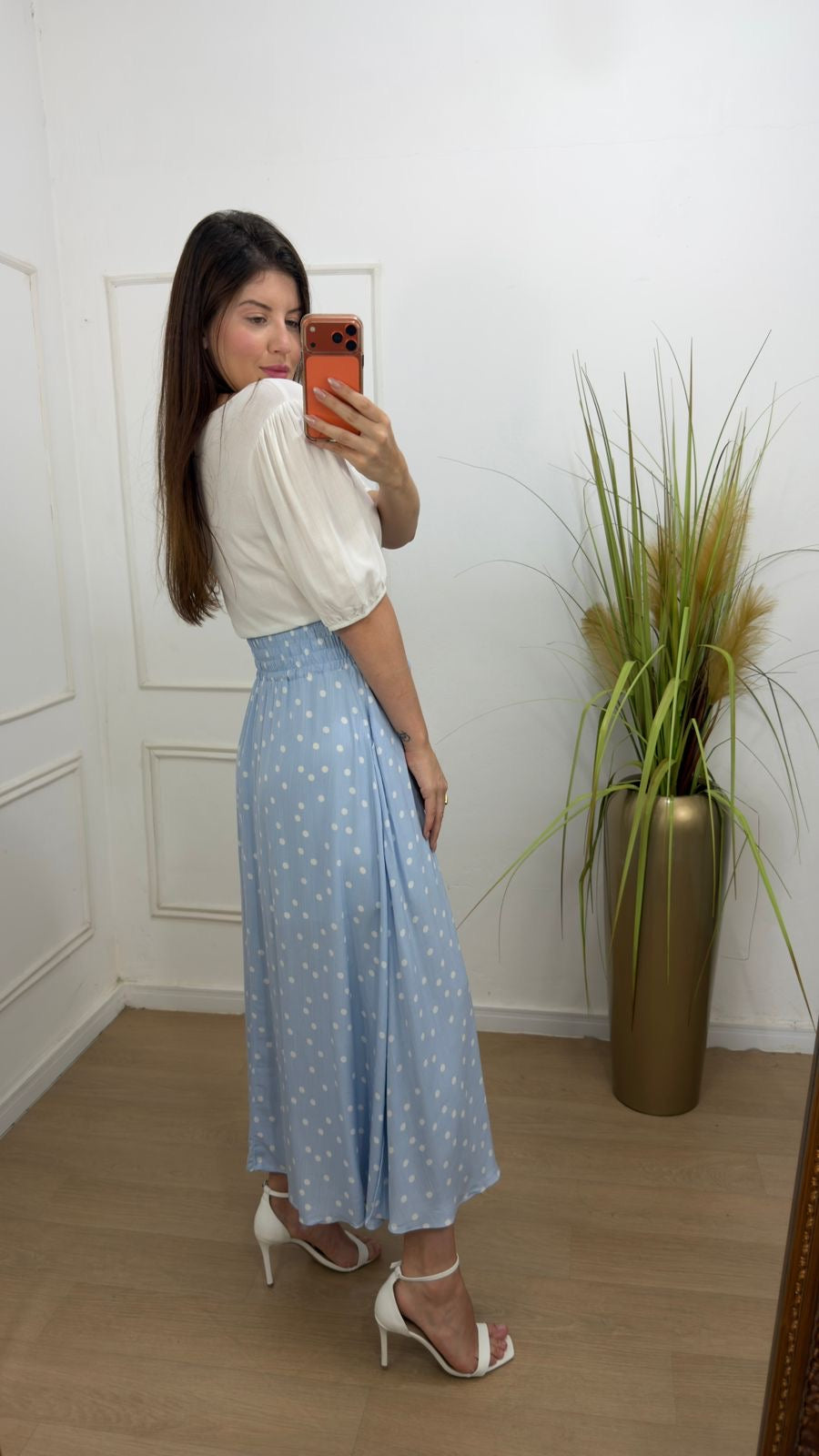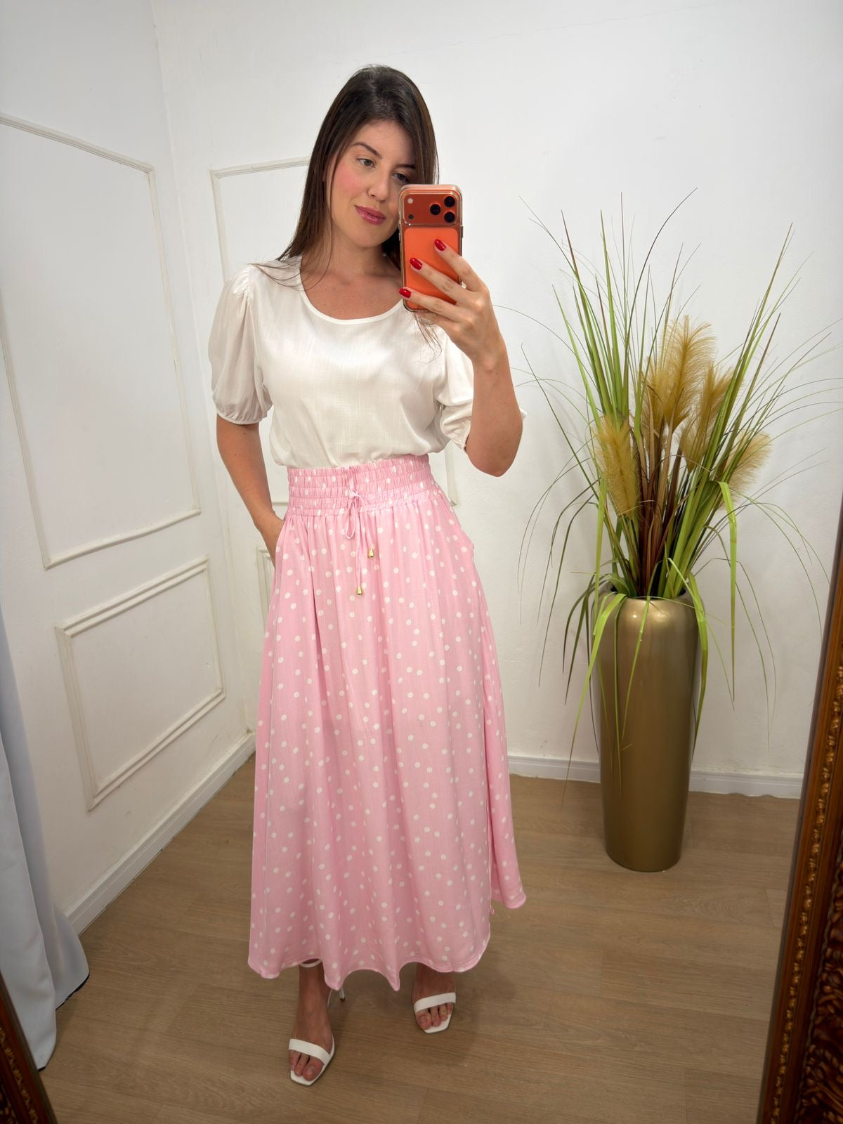 Saia no viscolinho + blusa viscose possui forro na saia, bolso na lateral, saia fluida, elástico no cós.