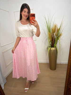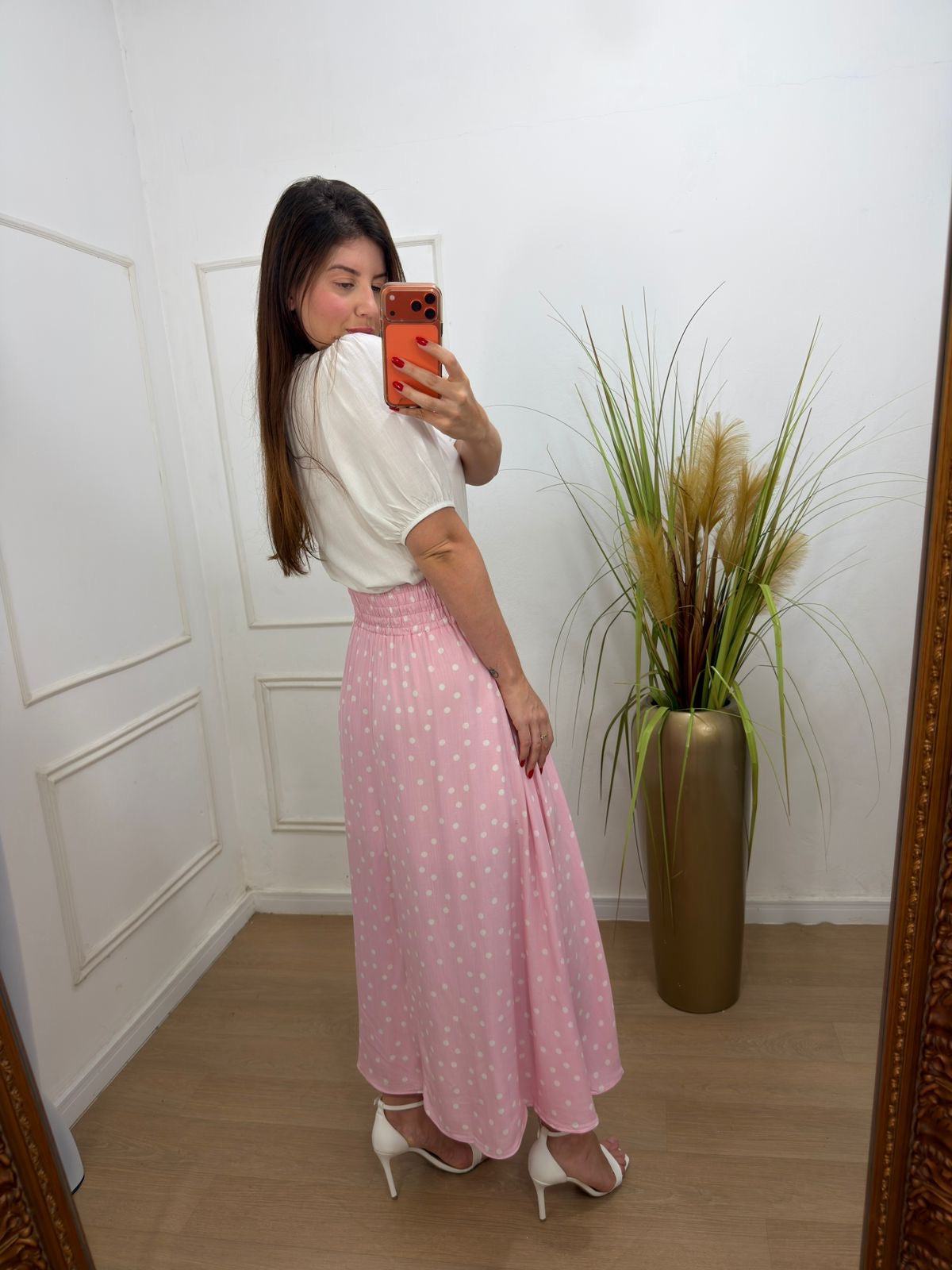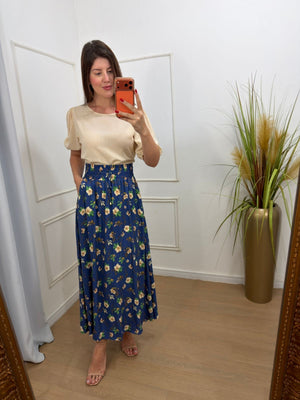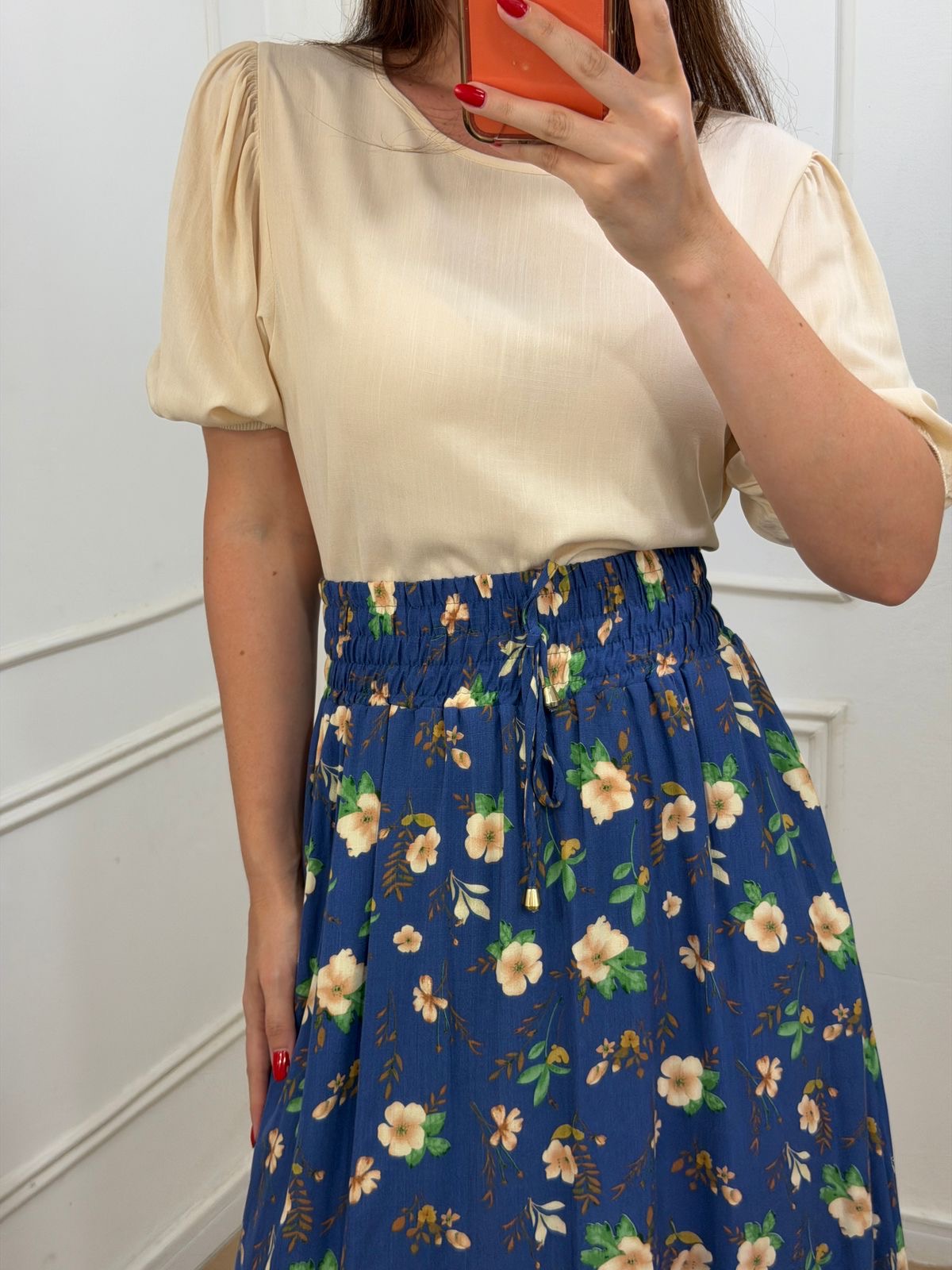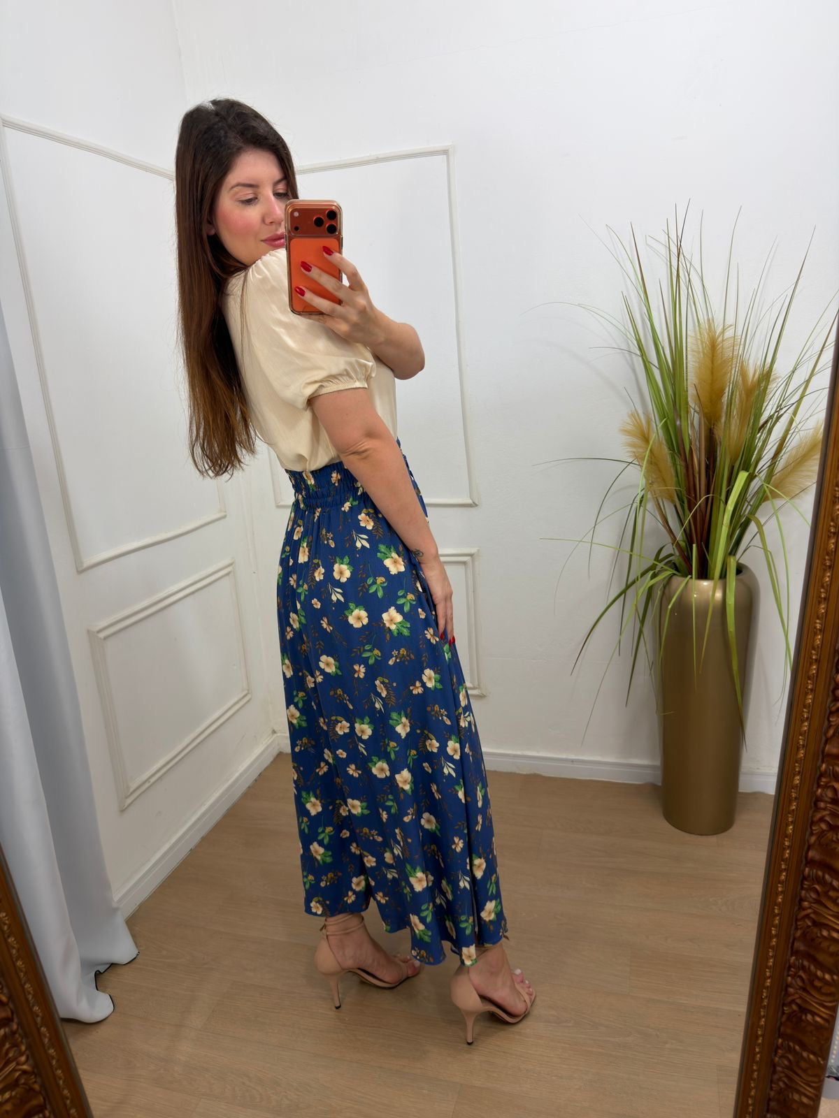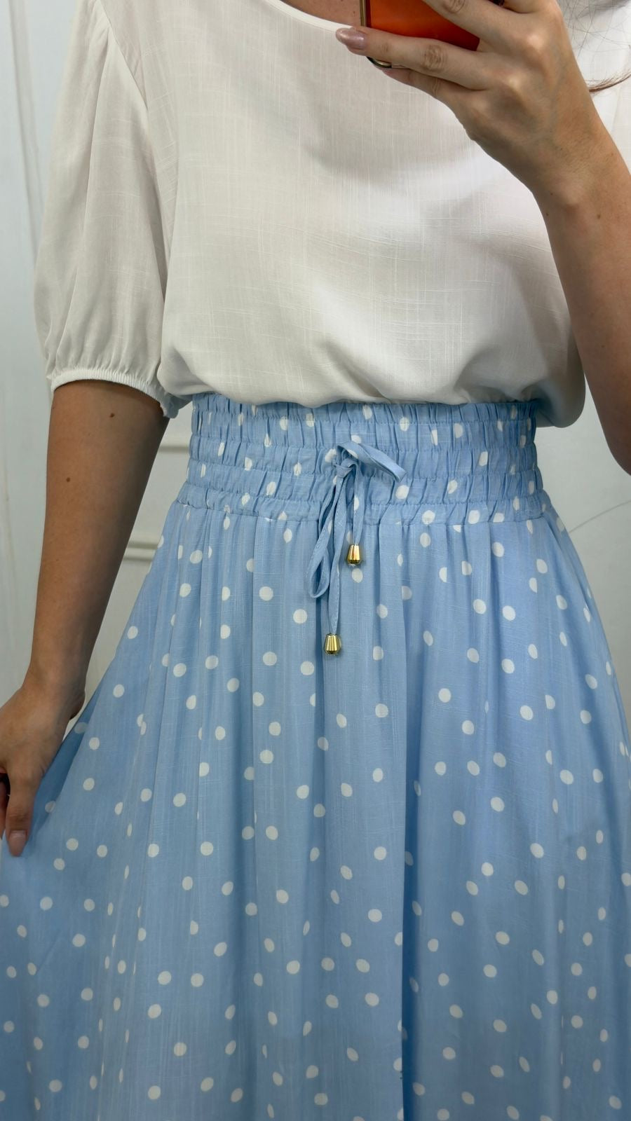 Saia no viscolinho + blusa viscose possui forro na saia, bolso na lateral, saia fluida, elástico no cós.
