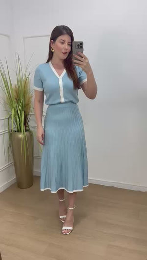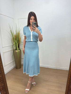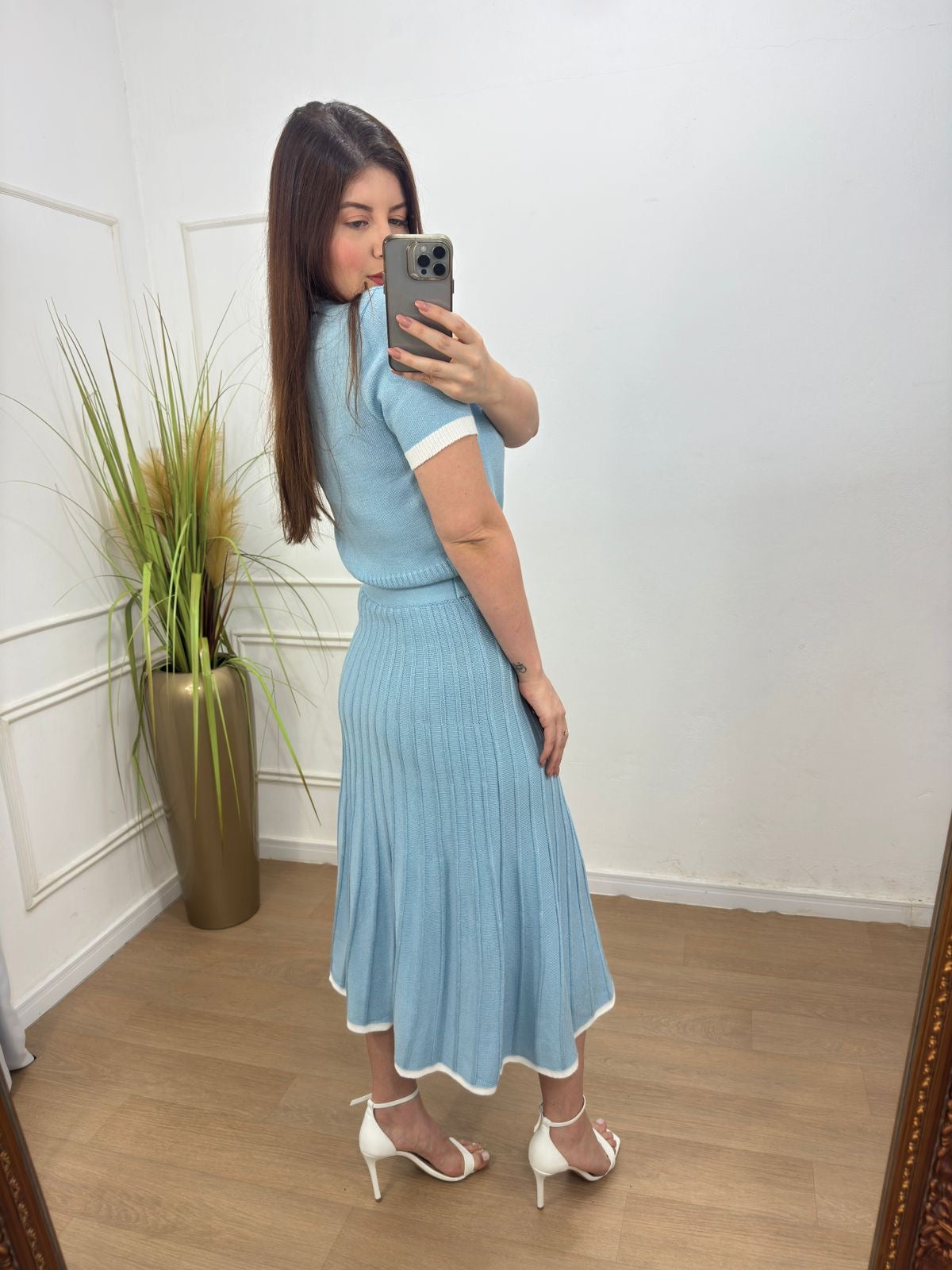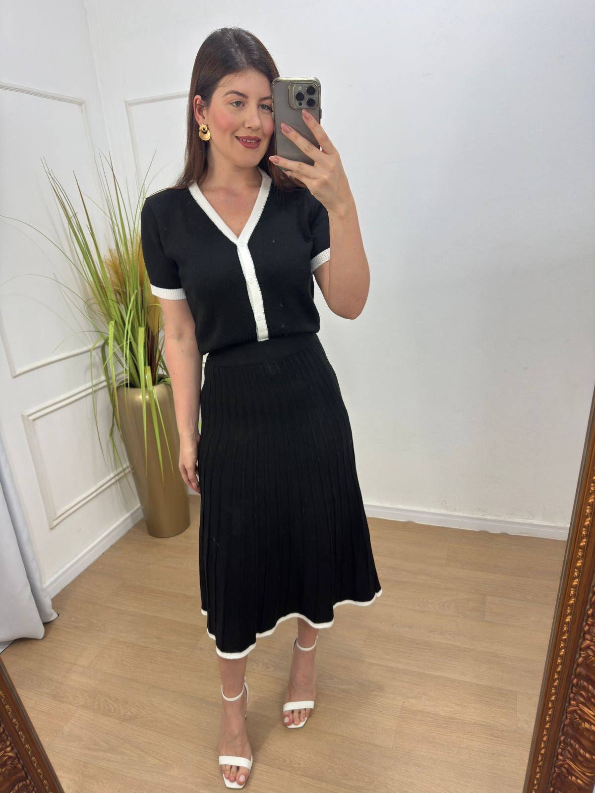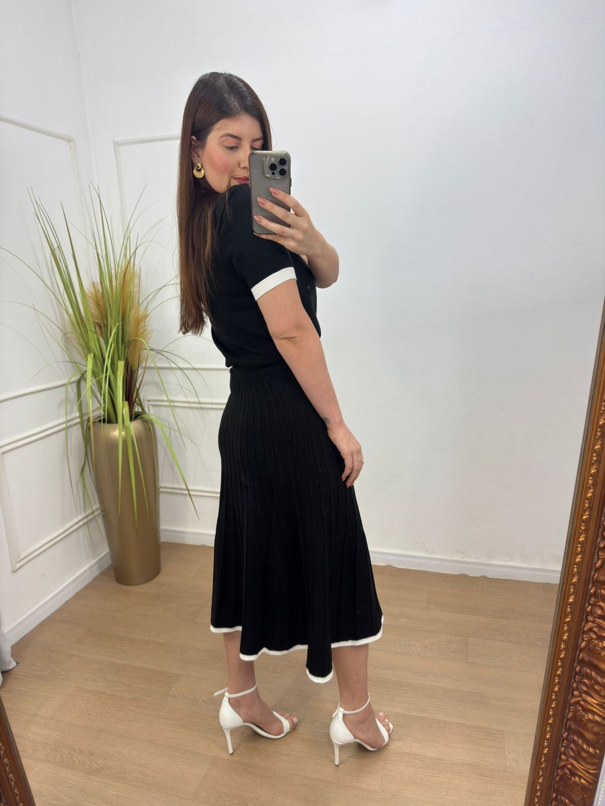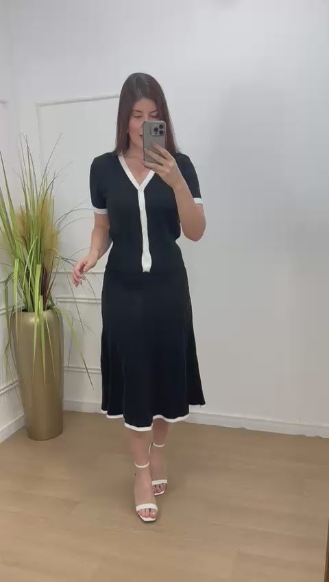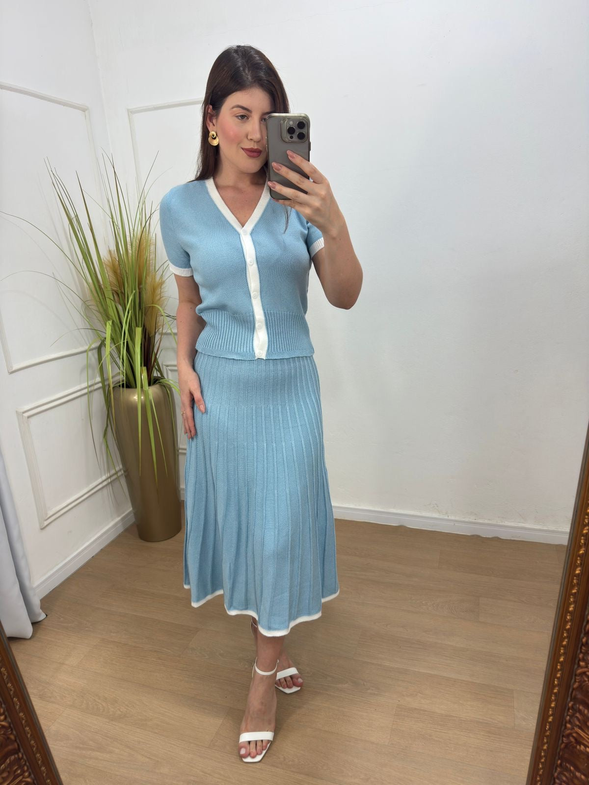 Conjunto em tricô modal com poliamida composto de blusa com botões+ saia midi evasê.
