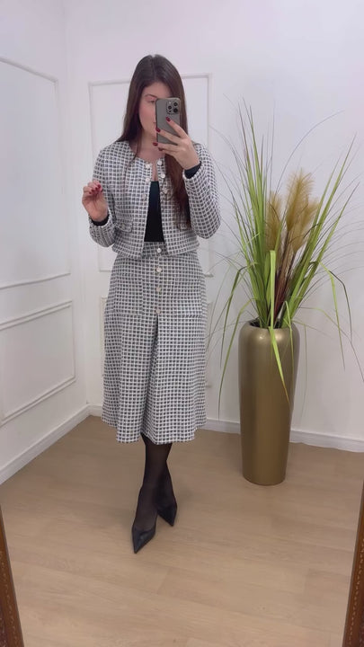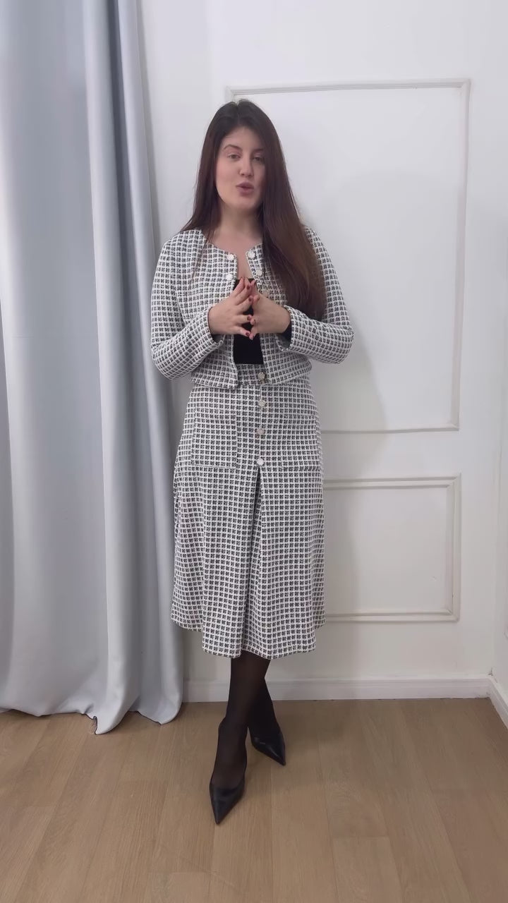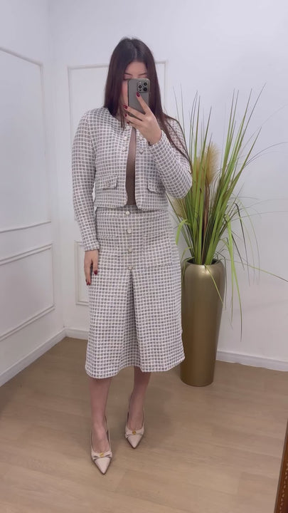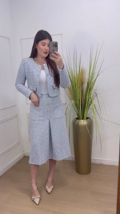 Nosso conjunto Vívian é confeccionado em malha tweed com elastano, um tecido encorpado que oferece conforto e caimento impecável.