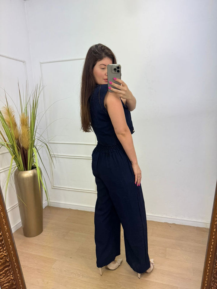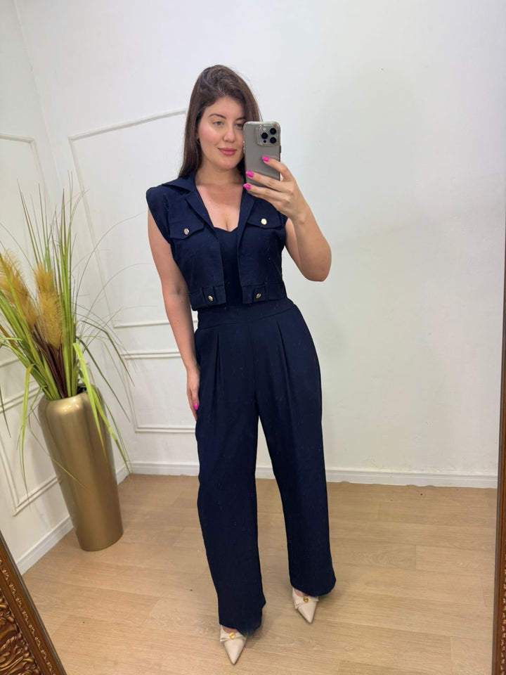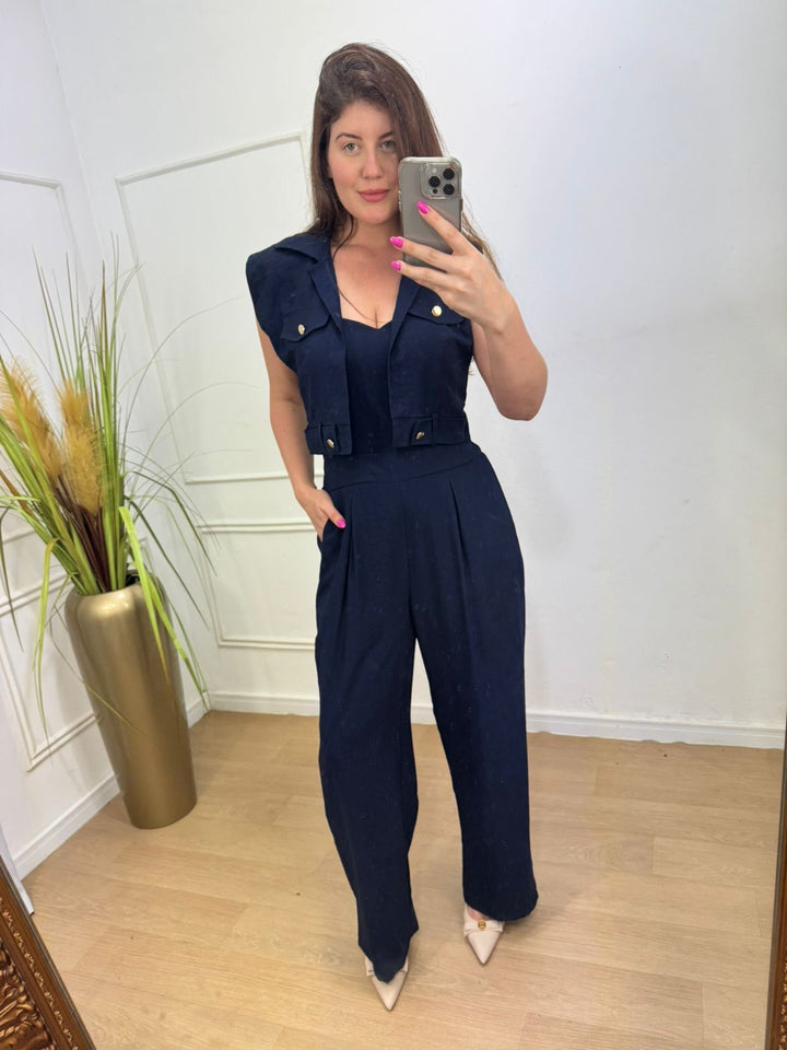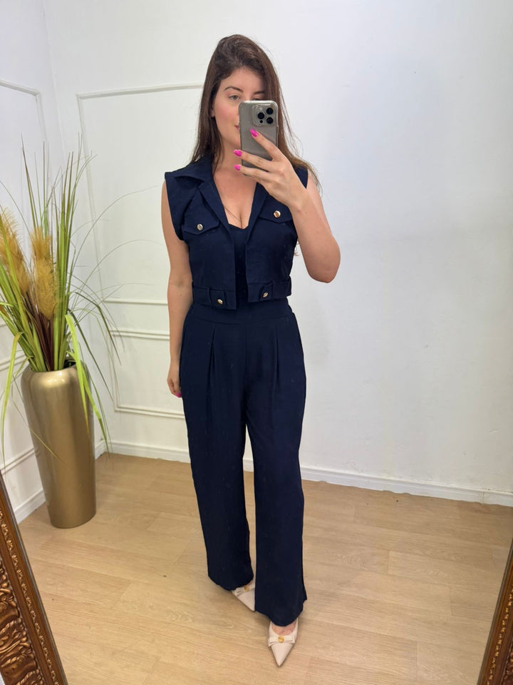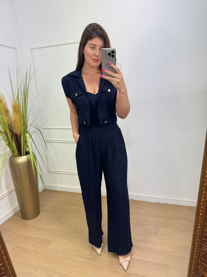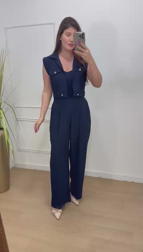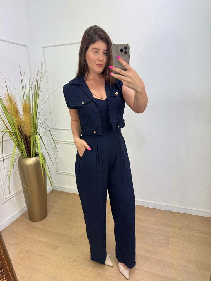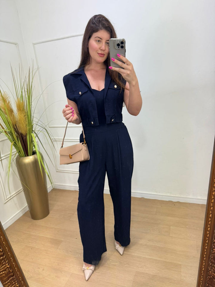Macacão no sensorial com toque de viscose, possui bolsos, ele é de alça e acompanha casaqueto ( possui bojo) elástico na cintura na parte das costas