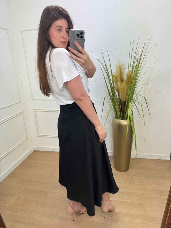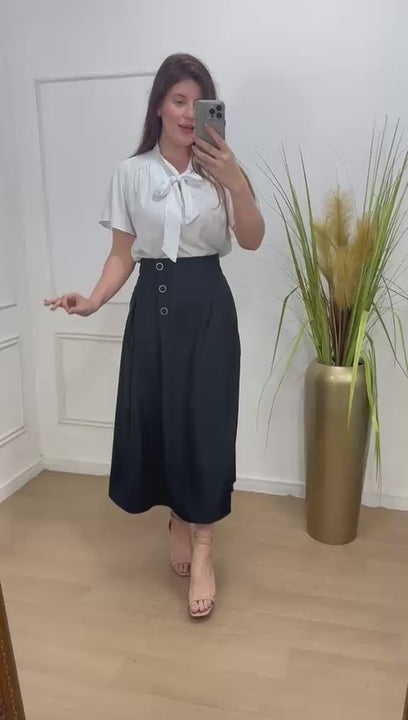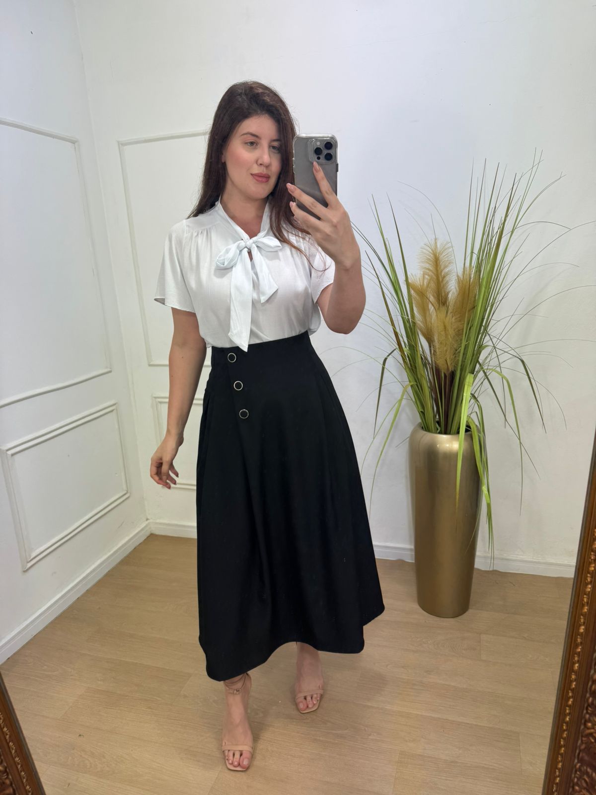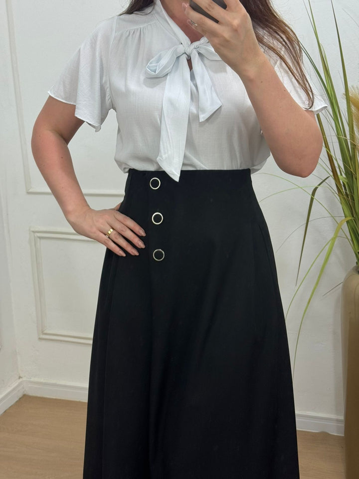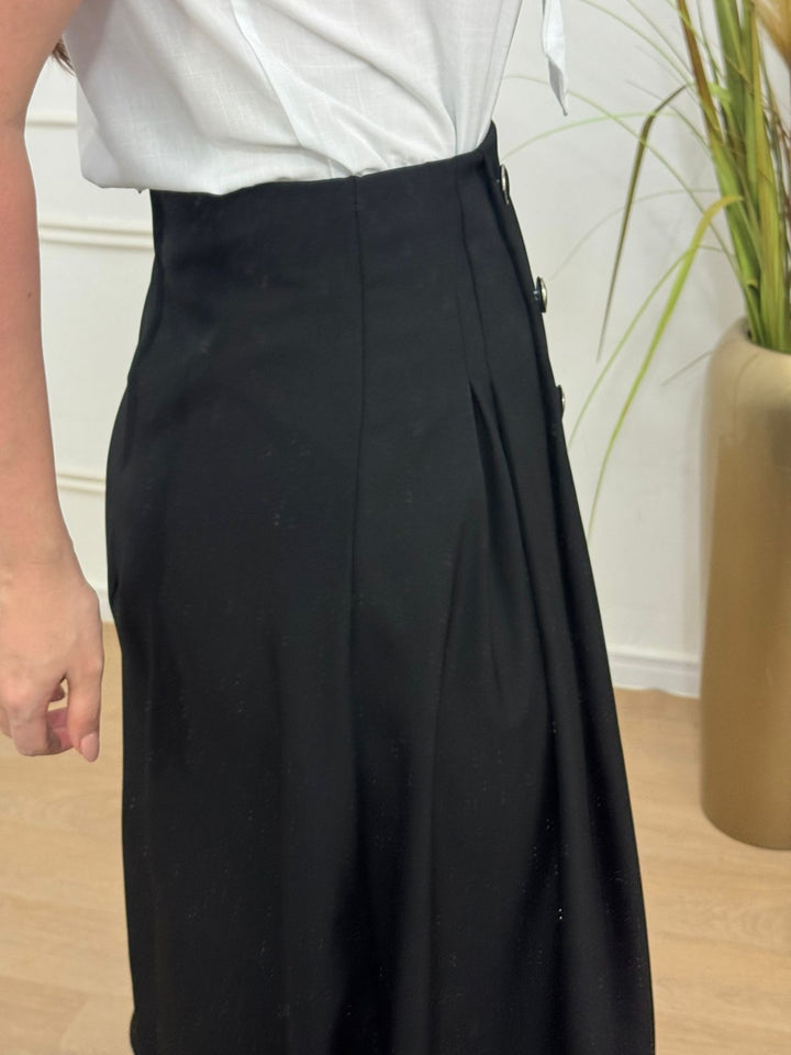 Saia na alfaitaria crepe possui zíper pregas frontais, botos forrado modelagem impecável.
