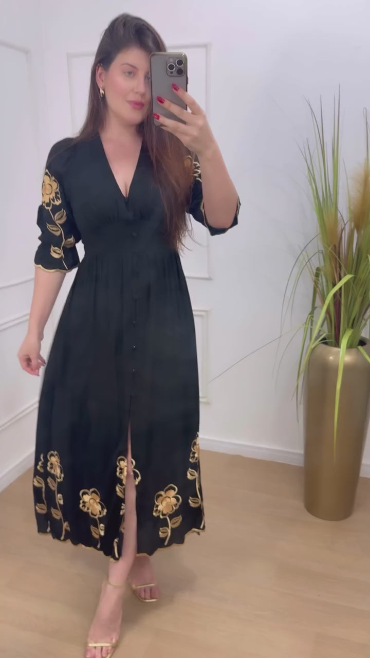 Descrição: vestido no viscosarja bordado forrado decote V botões não funcionais forrado, elástico nas costas.