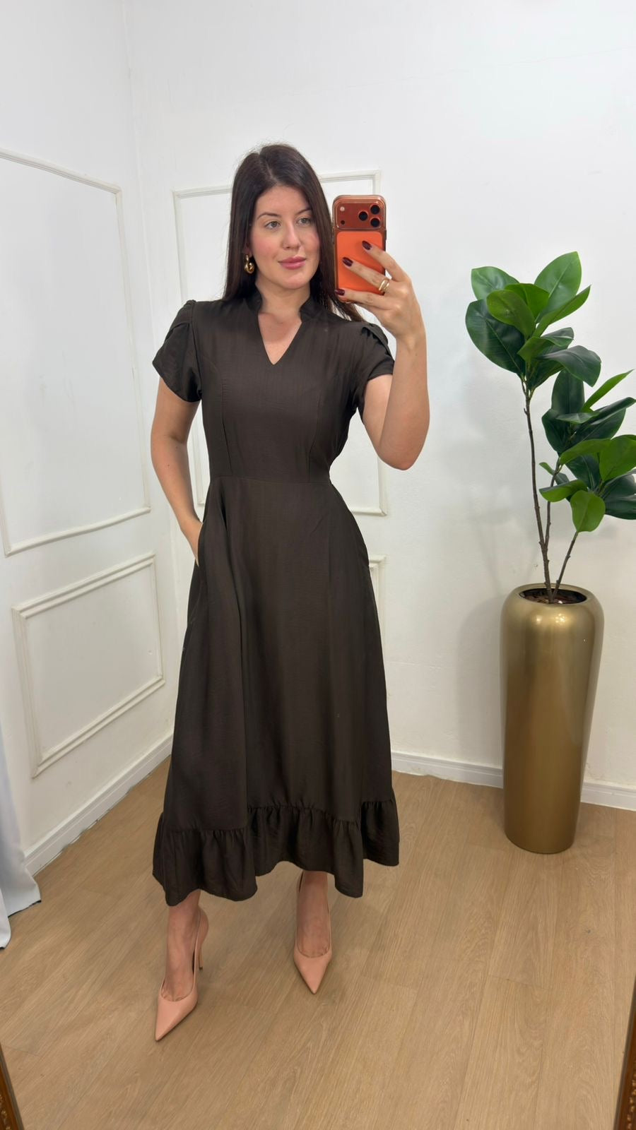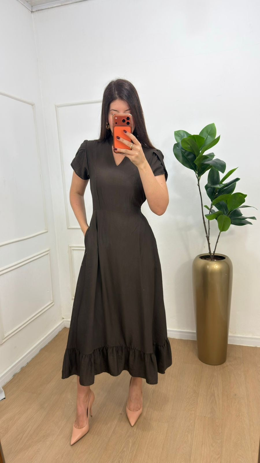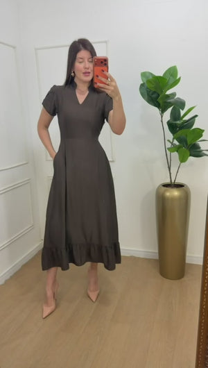 Vestido no viscolinho premium forrado manga transpassada, possui bolsos.