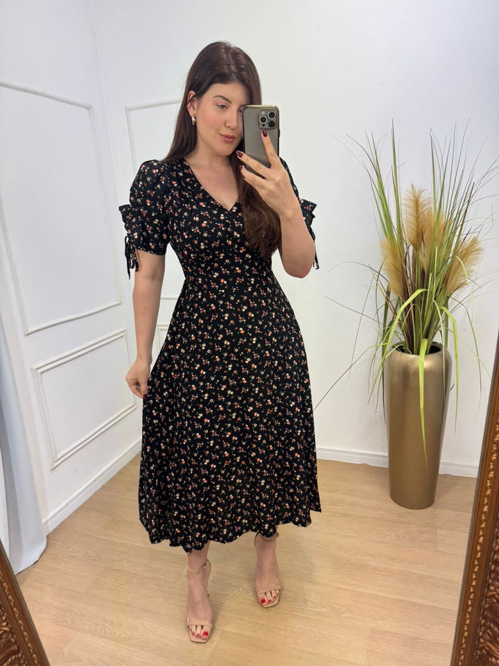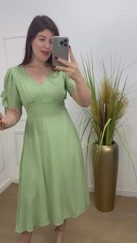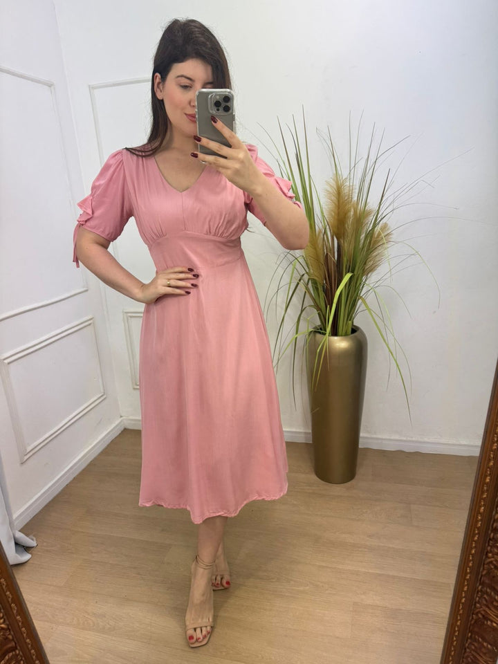 Vestido forrado no viscolinho premium lastex nas costas, amarração na manga modelagem evasê.