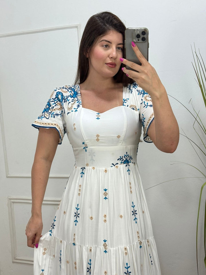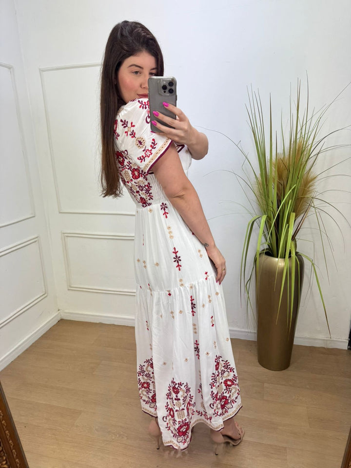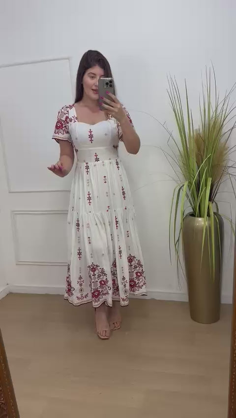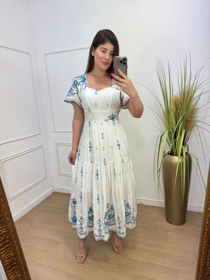 Vestido bordado com detalhes em laize no 100% algodão lastex nas costas.