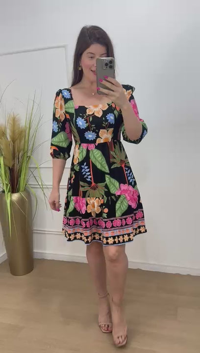 Vestido no viscolinho forrado lastex nas costas manga 3/4