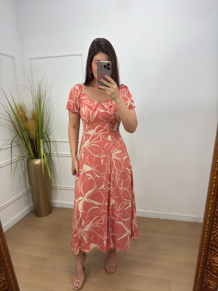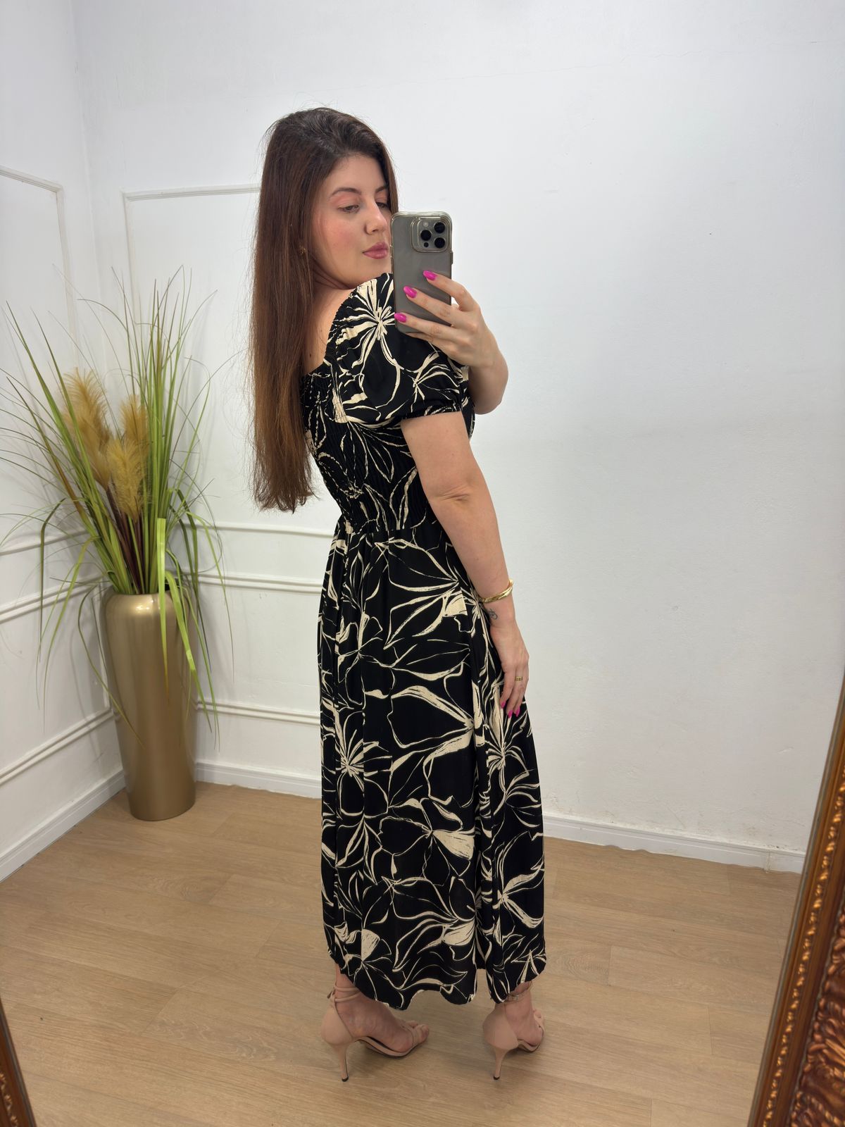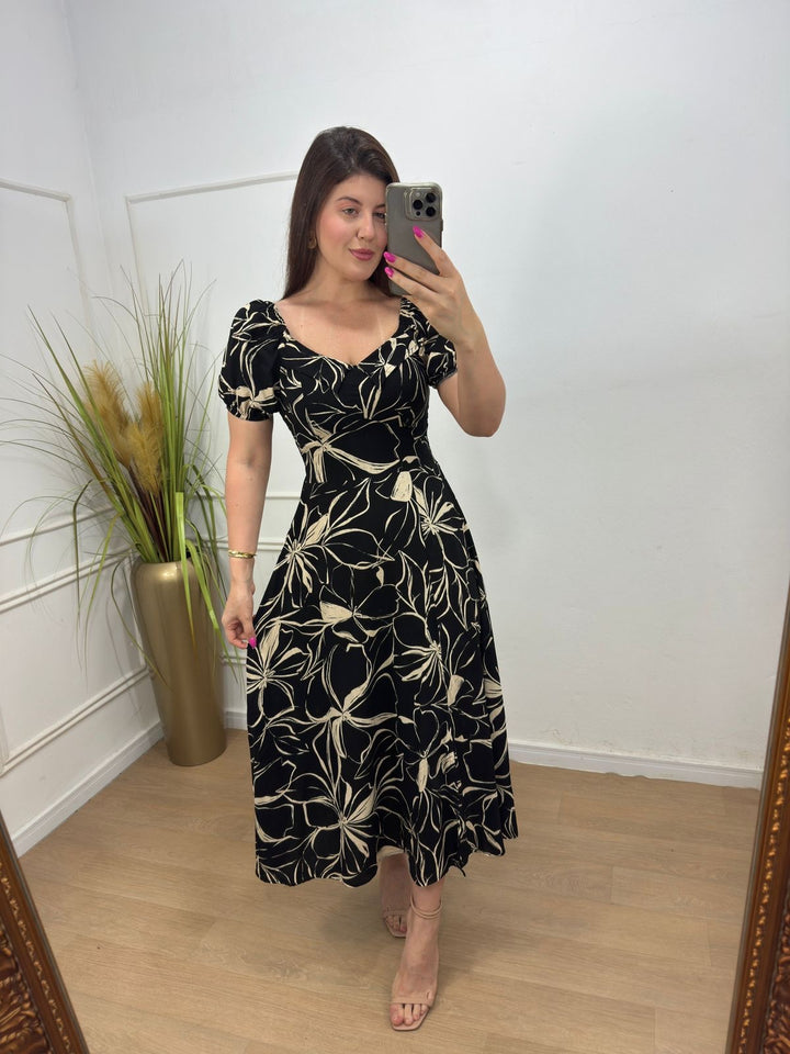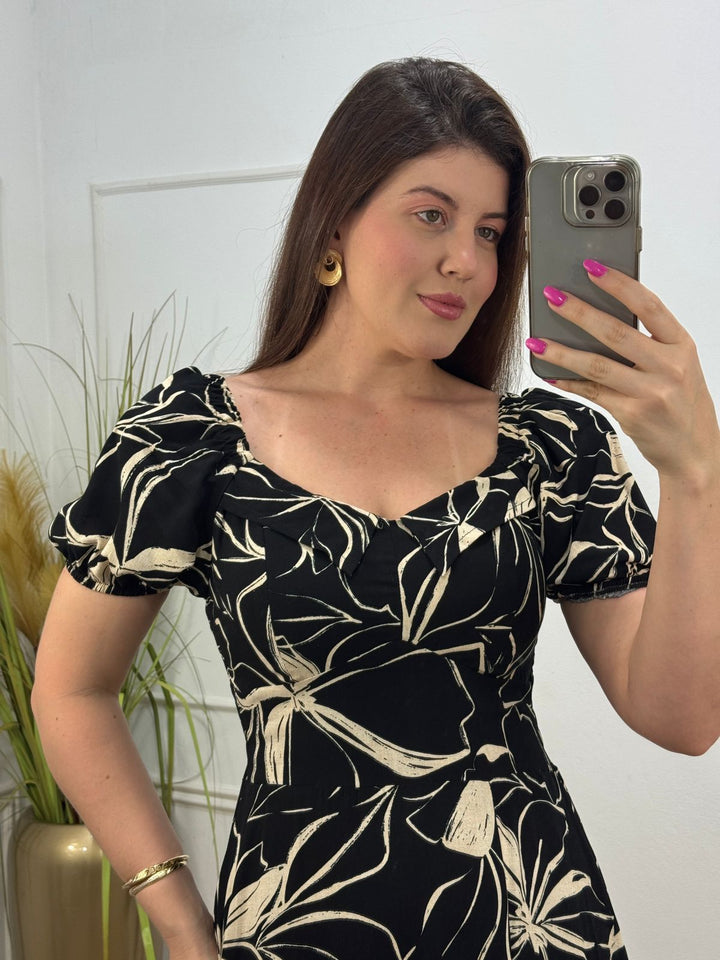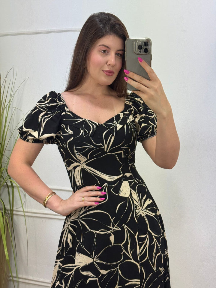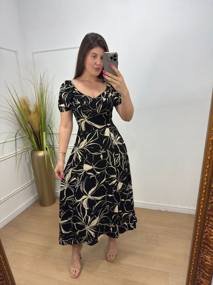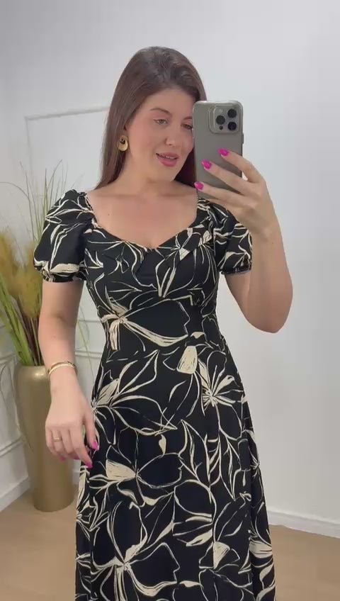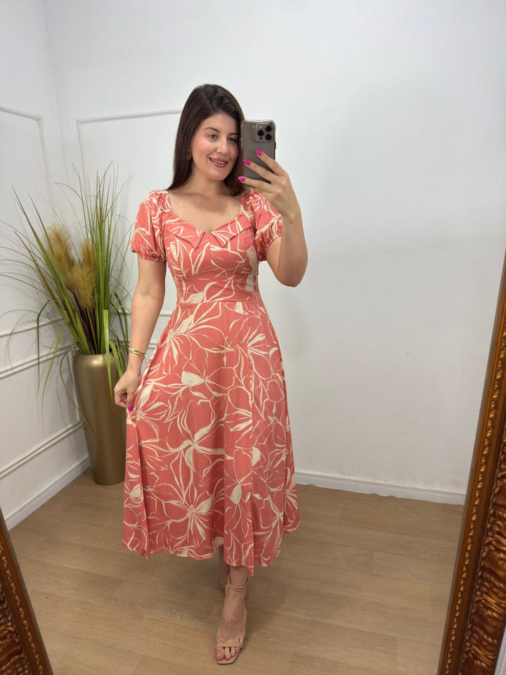 Vestido Joana no viscolinho premium forrado modelagem evasê possui detalhes na gola, elástico na manga.