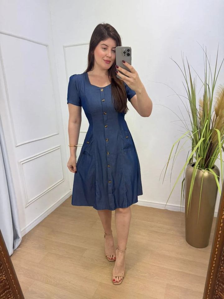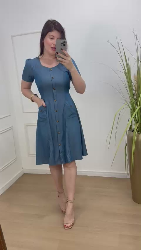 Vestido no jeans fluido sem elastano, possui lastex nas costas, bolso, modelagem evasê.