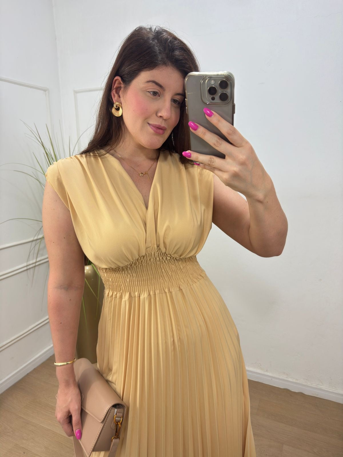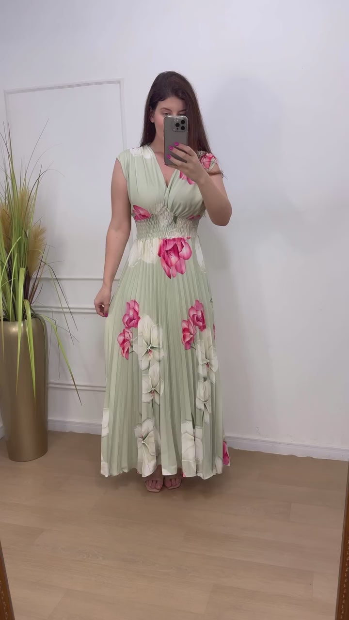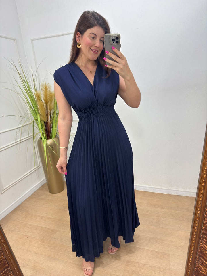 Vestido no crepe alfaitaria plissado decote transpassado.