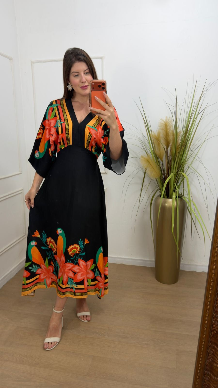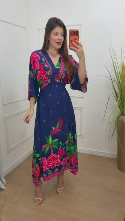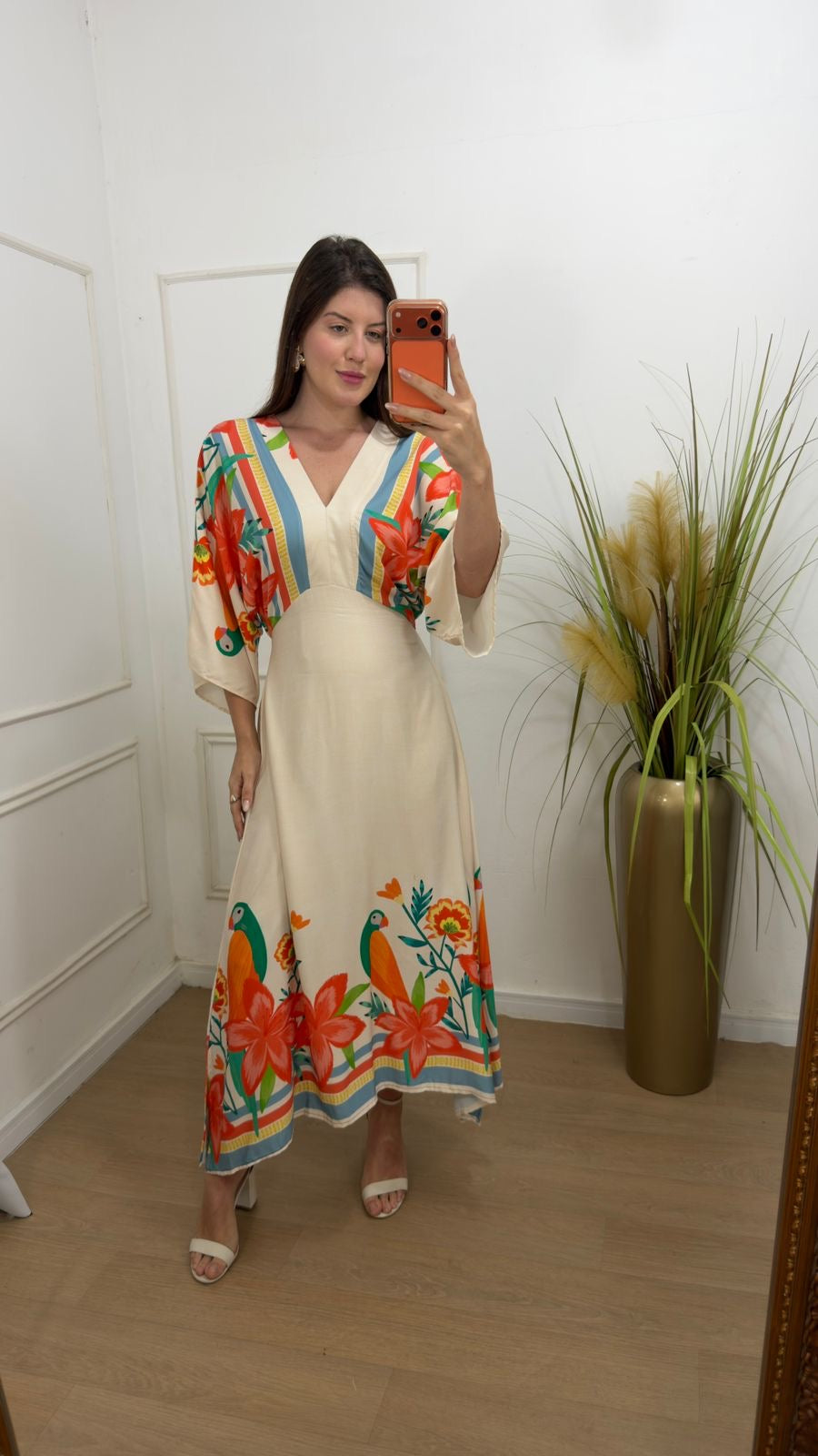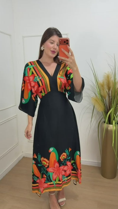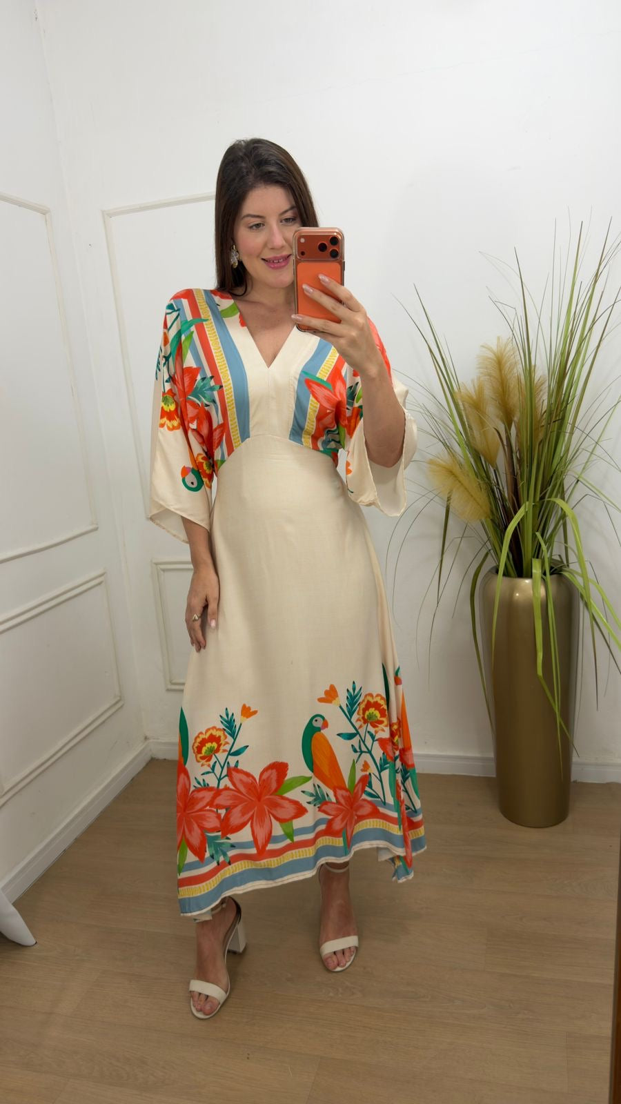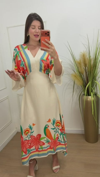 Vestido no viscolinho elástico na parte das costas, manga ampla , não possui forro.