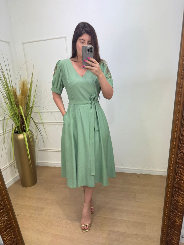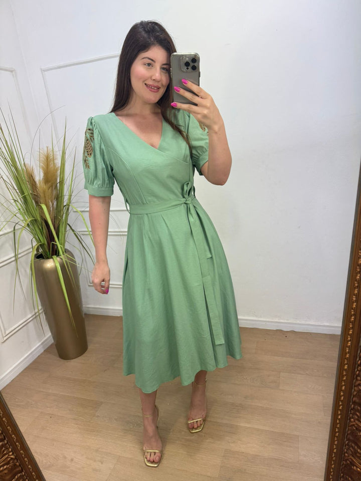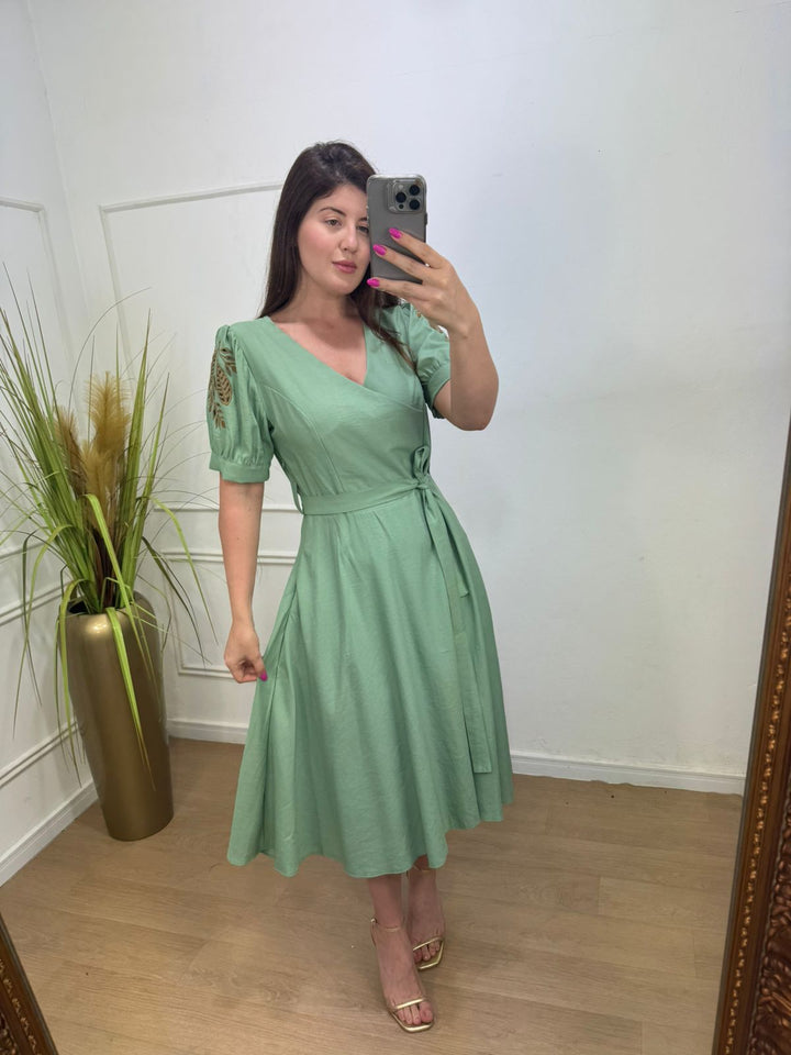 Vestido na alfaitaria sensorial possui forro, detalhe bordado nas mangas acompanha cinto, zíper invisível na lateral.