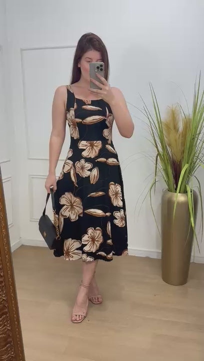 Vestido em viscolinho forrado de alça larga ( pode ser usado com sutiã) forrado, modelagem evasê, lastex nas costas.