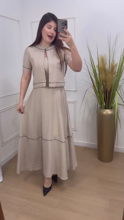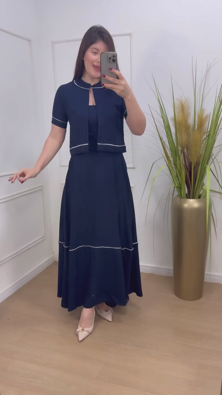 Descrição: vestido na sarja em alças com regulagem, bojo , modelagem super midi acompanha casaqueto podendo usar aberto ou fechado.