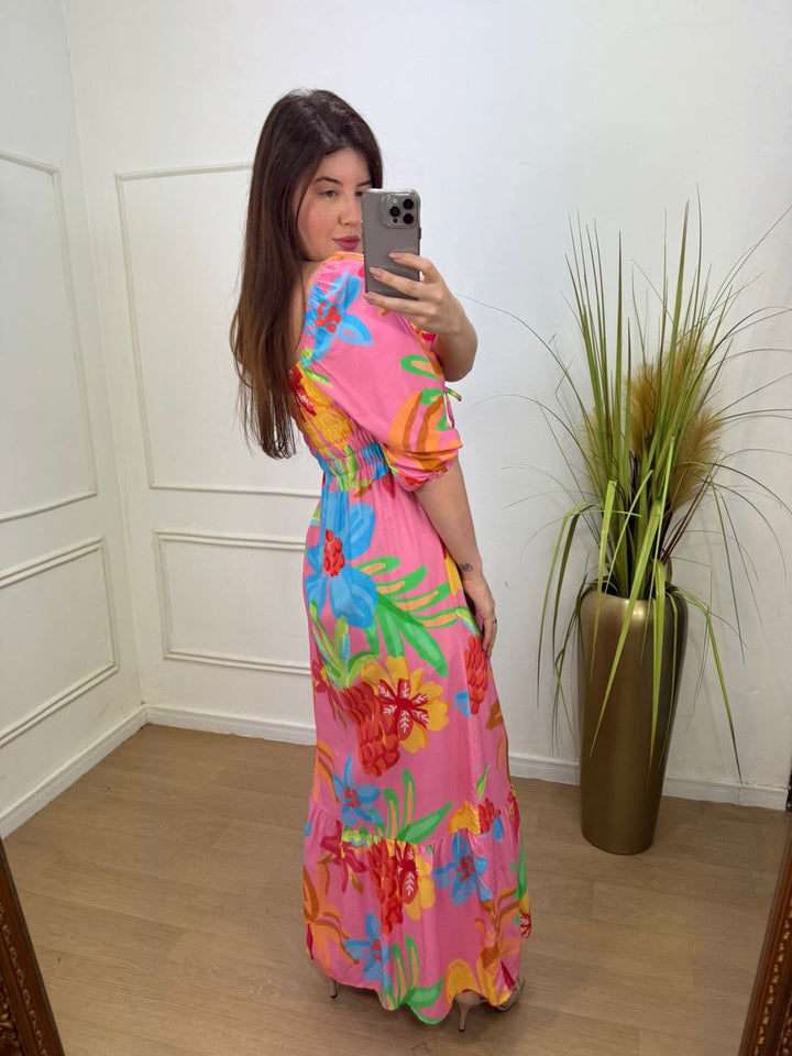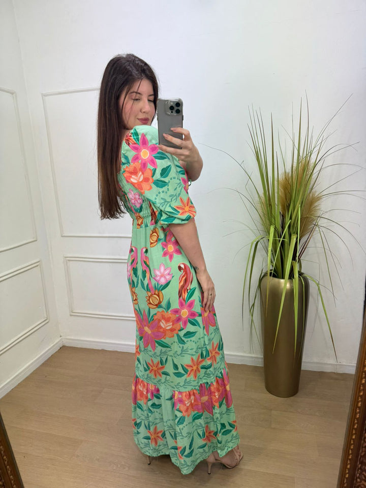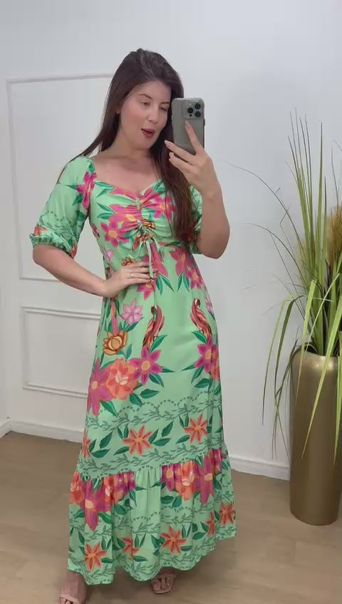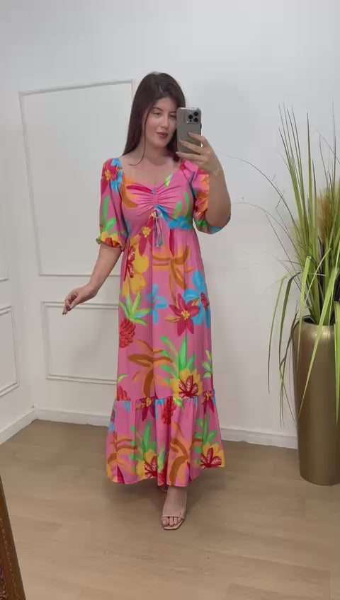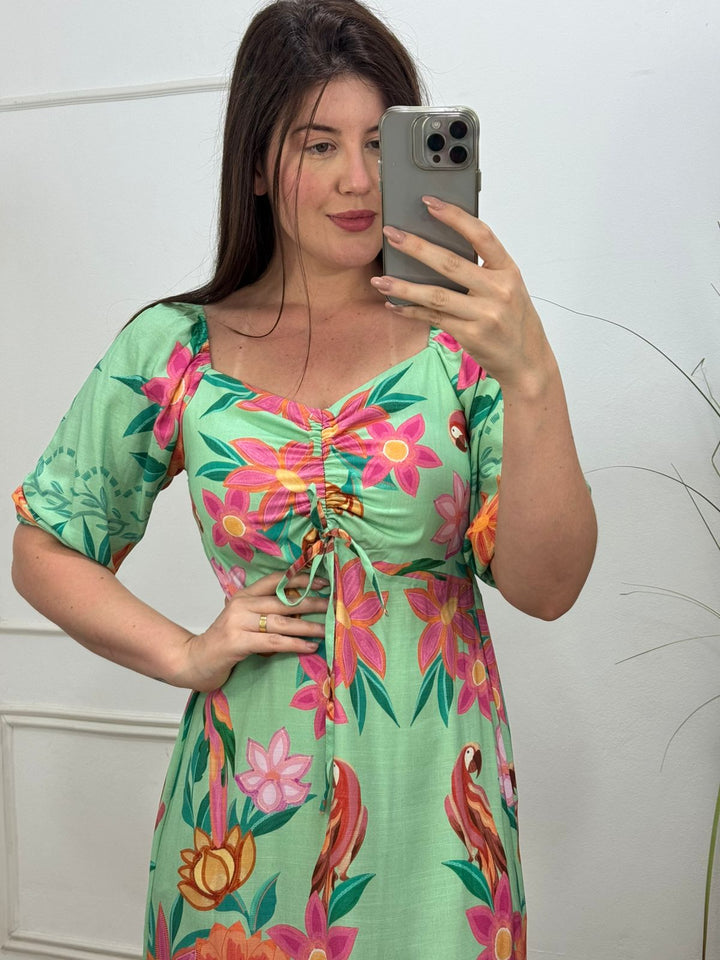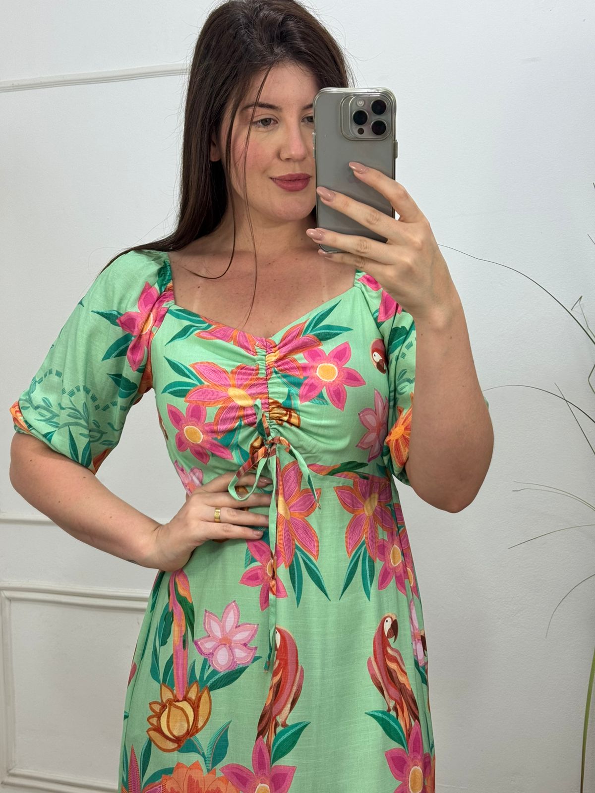 Vestido no viscolinho premium detalhe no busto de amarração, lastex nos ombros e mangas e nas costas.