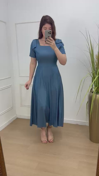 Vestido na sarja jeans tecido fluido , leve com bastante caimento , detalhe em laço nos ombros e lastex nas costas.